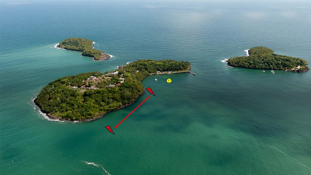 Le lendemain, annexe à l’eau, on s’en va visiter l’île à pinces, les dépliants touristiques vantent des plages immaculées, une faune abondante et des paysages accidentés, voyons voir.