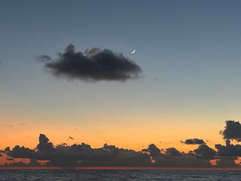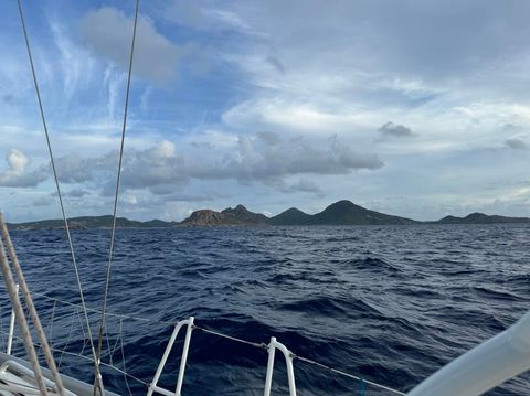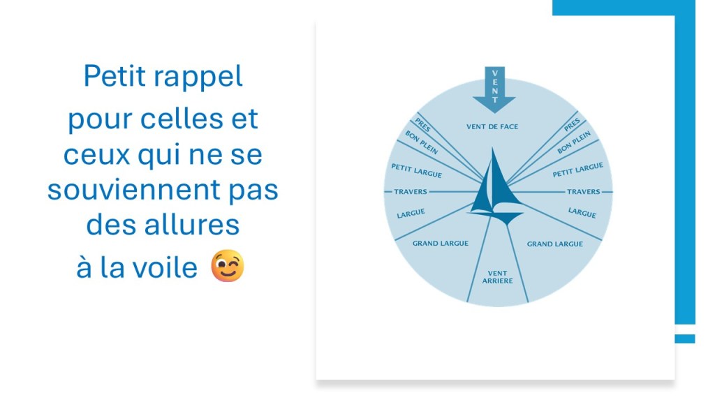 Aujourd’hui est un beau jour, mais même quand il n’y a pas un grain qui nous tombe dessus au près (ce qui fait giter le bateau et qu’on se prend des seaux de mer pendant qu’on prend un ris en toute hâte) et qu’on navigue au travers et au portant comme aujourd’hui, ça vente et ça bouge, je commence à croire que la mer n’est jamais calme par ici.