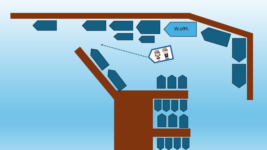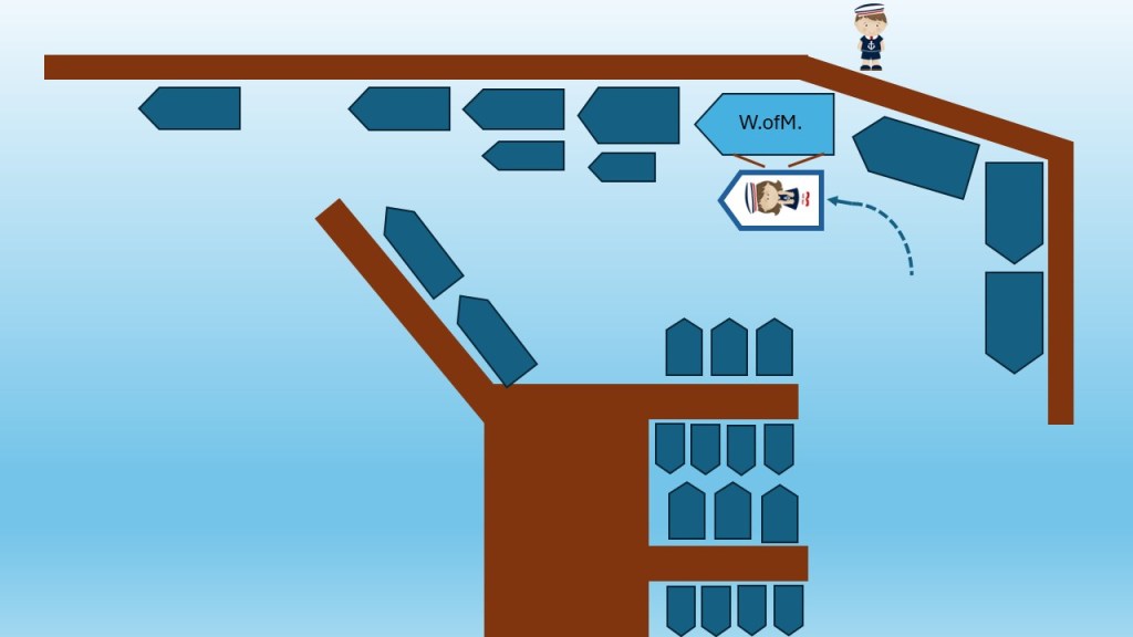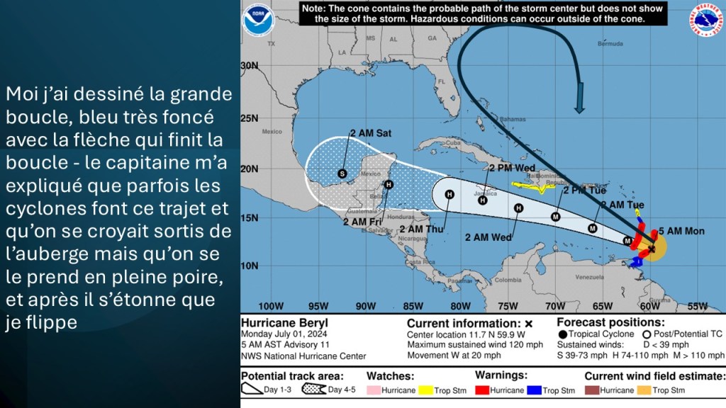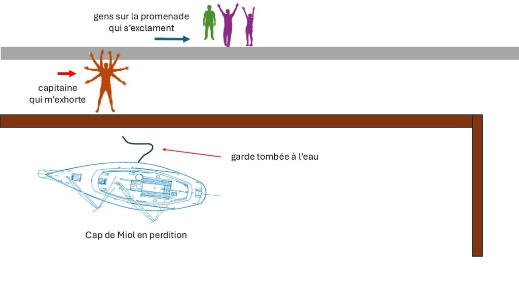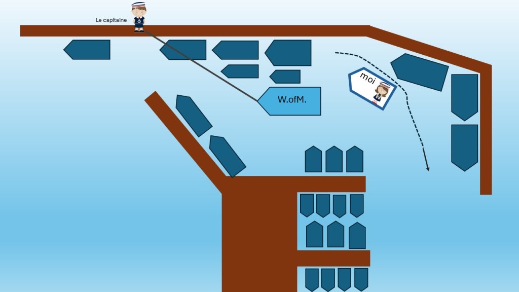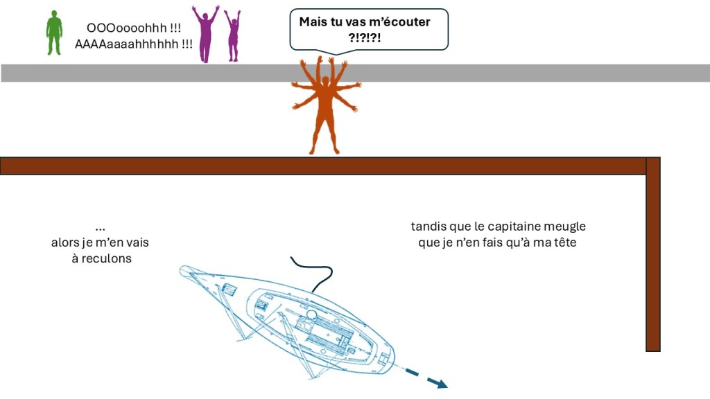 Je me retrouve comme une imbécile avec la barre dans la main, le bateau s’en va où bon lui semble, le capitaine m’invective, mais où tu vas ?! j’agite le bras qui tient la barre,