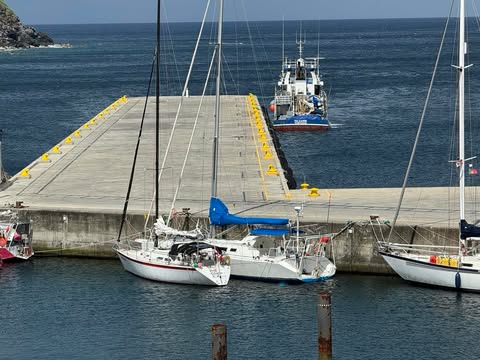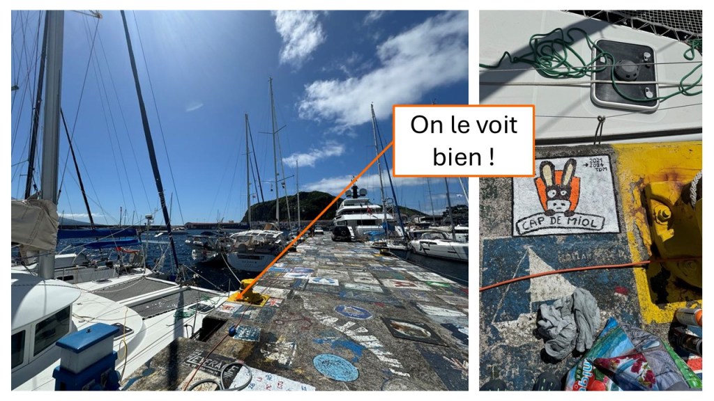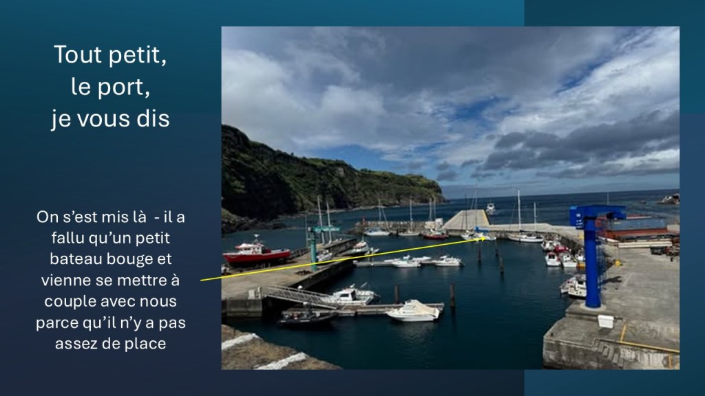 Nous nous amarrons à une grosse bouée bien protégée dans le petit port, mais nous faisons dégager vite fait par le pêcheur à qui appartient la bouée quand il revient de son labeur, un autre, plus amène, vient à notre rescousse en nous indiquant celle à laquelle on peut se mettre et d’où nous ne serons pas délogés, on est plus loin de la digue, le capitaine tique, quand ça soufflera on bougera plus, parfois le capitaine est trop exigeant. Je trouve. Lui pense que je suis trop gentille et que je me fais avoir.
