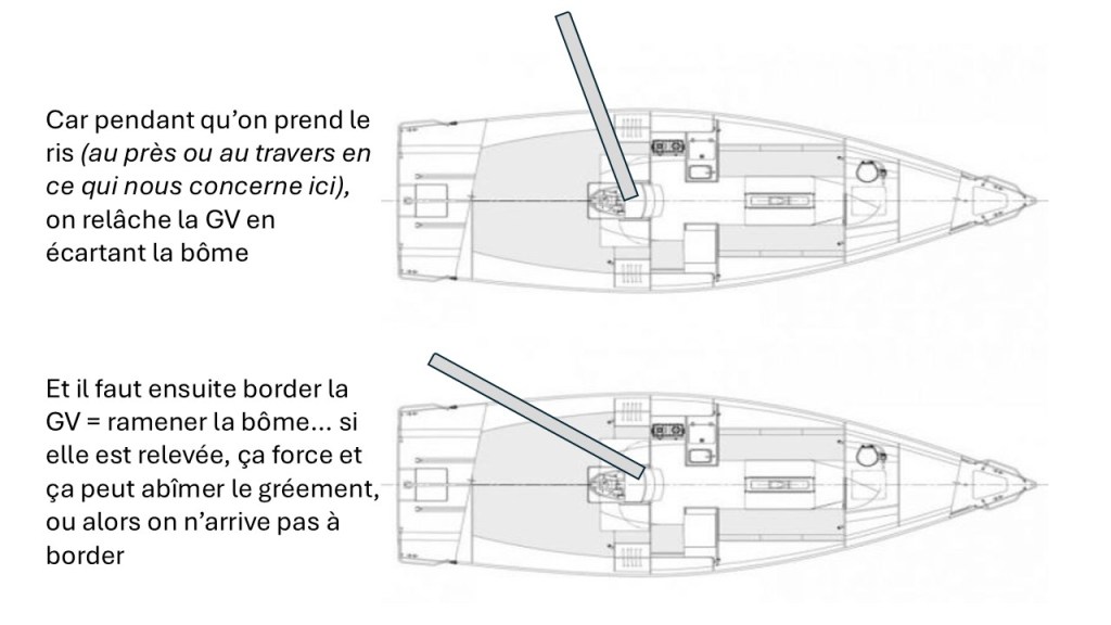Ensuite il faut bien remplacer la barre, heureusement on a gardé la barre d’origine, plus courte que celles (le bateau est un bi safran donc il y a deux barres) que le capitaine avait fait refaire , et moins jolie à son sens, le capitaine enlève le morceau qui reste et remet la vieille, il se plaint que le menuisier qui a fait la nouvelle barre n’est pas bon, je me permets de lui redire ce que j’avais avancé lorsqu’il l’avait fait fabriquer, à savoir que je n’aurais jamais choisi du bois de sapin pour faire une barre, que celle d’origine était en chêne et que ça me paraît plus adapté, il balaie mon argument d’un geste agacé, je ne vais pas, en plus, lui faire porter la faute alors qu’elle a rendu l’âme dans mes mains. Bon, elle pourra toujours servir, pour faire partir un feu de cheminée un soir de Noël par exemple.