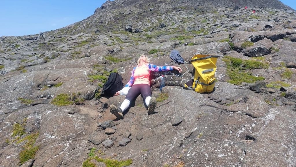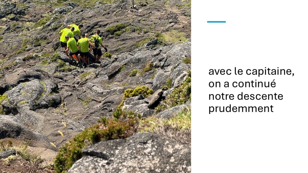 arrivés en haut, le vent est si fort que je dois me mettre à genoux pour ranger mon téléphone dans mon sac parce que si jamais je ripe sur une crotte à la descente, il risquerait de m’échapper des mains et de se fracasser sur un rocher, on en arrive à de telles extrémités.