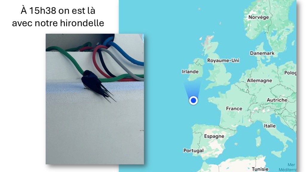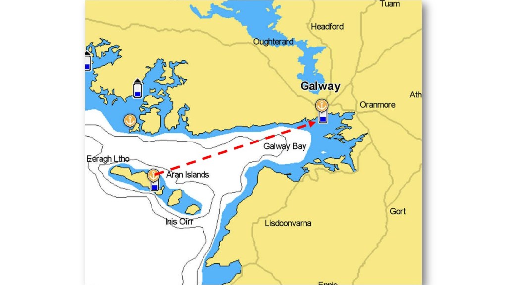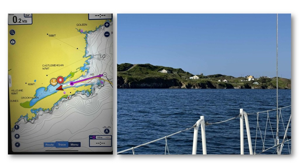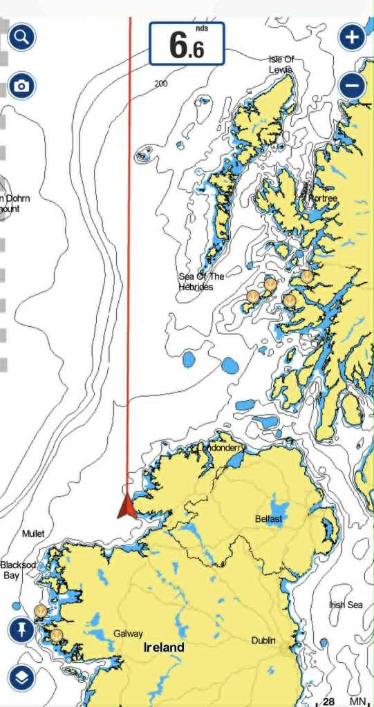 Comme si j’avais donné un coup de hache sur la barre, faut pas pousser, je passe la marche avant, on se met au pilote pour se mettre face au vent et hisser la GV, nous voilà partis sans barre tribord pour l’île Inishmore, une des îles d’Aran, une longue journée en perspective avec 58 NM à faire, espérons que la mer se calmera.