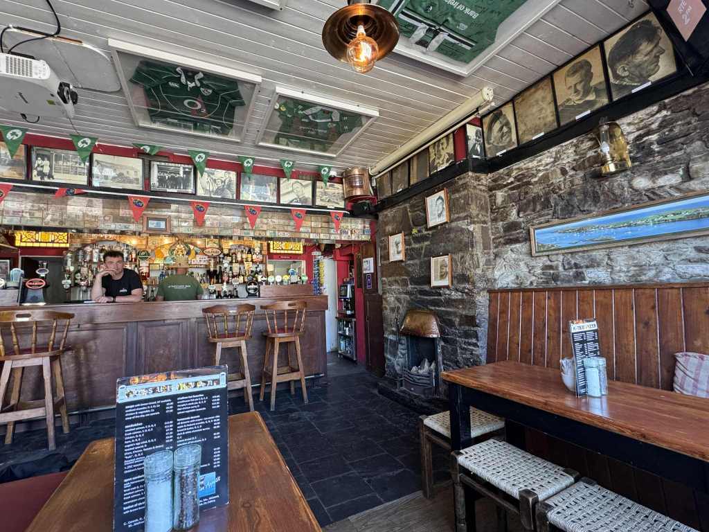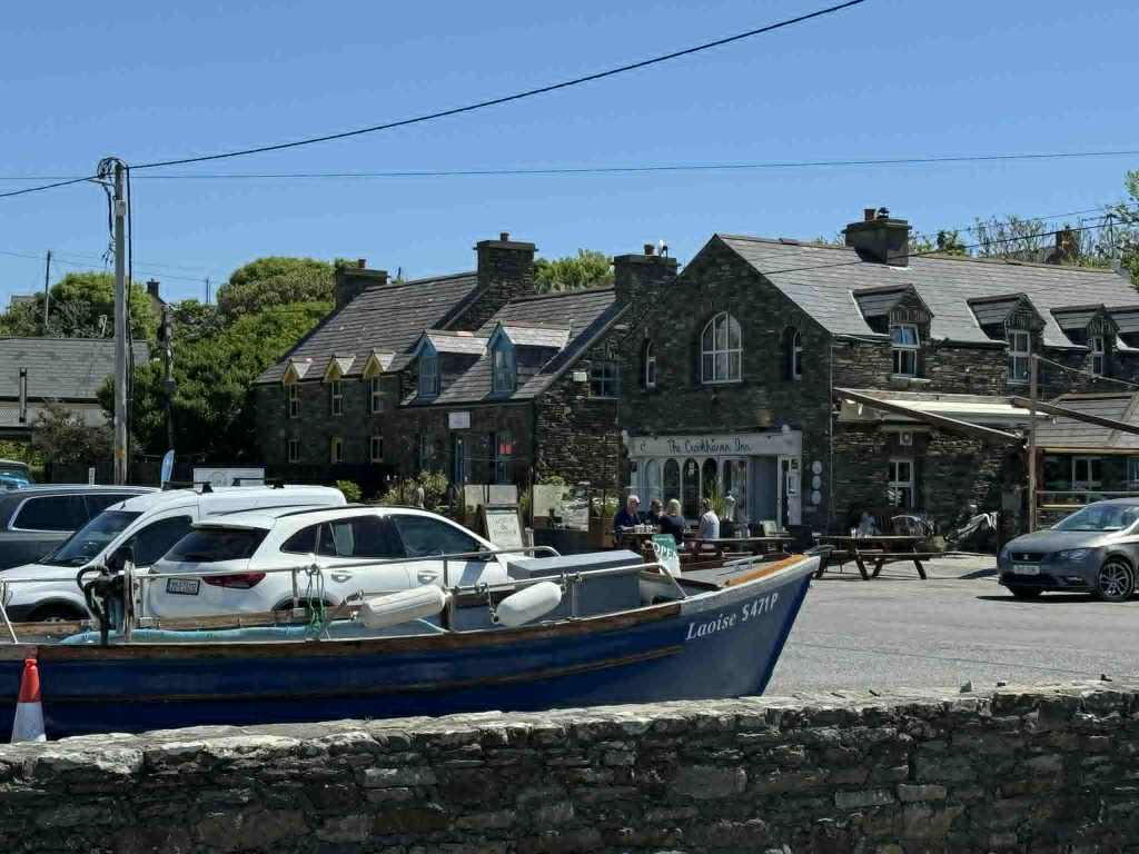 On pourra dire que nous les avons vues, de loin, certes, ce qui n’entame aucunement l’humeur du capitaine qui en est fort réjoui, passé ce moment fort en émotion, nous nous posons à Valentia Island, exactement nous nous amarrons le long d’un ponton en béton à Knighstown, ce n’est pas ce qu’on peut appeler un petit port cosy mais c’est plus pratique pour sortir les vélos et s’en aller visiter l’île le lendemain, après avoir été invitée le soir même au resto de l’hôtel du bled pour fêter dignement mon anniversaire, le capitaine se régalant d’un fish&chips et moi d’un crevettes&chips, vous me direz que vous n’en avez rien à faire mais le fait est remarquable parce que depuis on en a bouffé du fish&chips, on est même devenus des spécialistes de l’affaire, et bien je peux vous dire qu’aucune panure, je dis bien aucune ! n’a jamais égalée celle de ce soir là, une panure à la bière à se lécher les doigts, légère et croustillante à souhait, c’est au Royal Hôtel Valentia si vous y passez un jour.