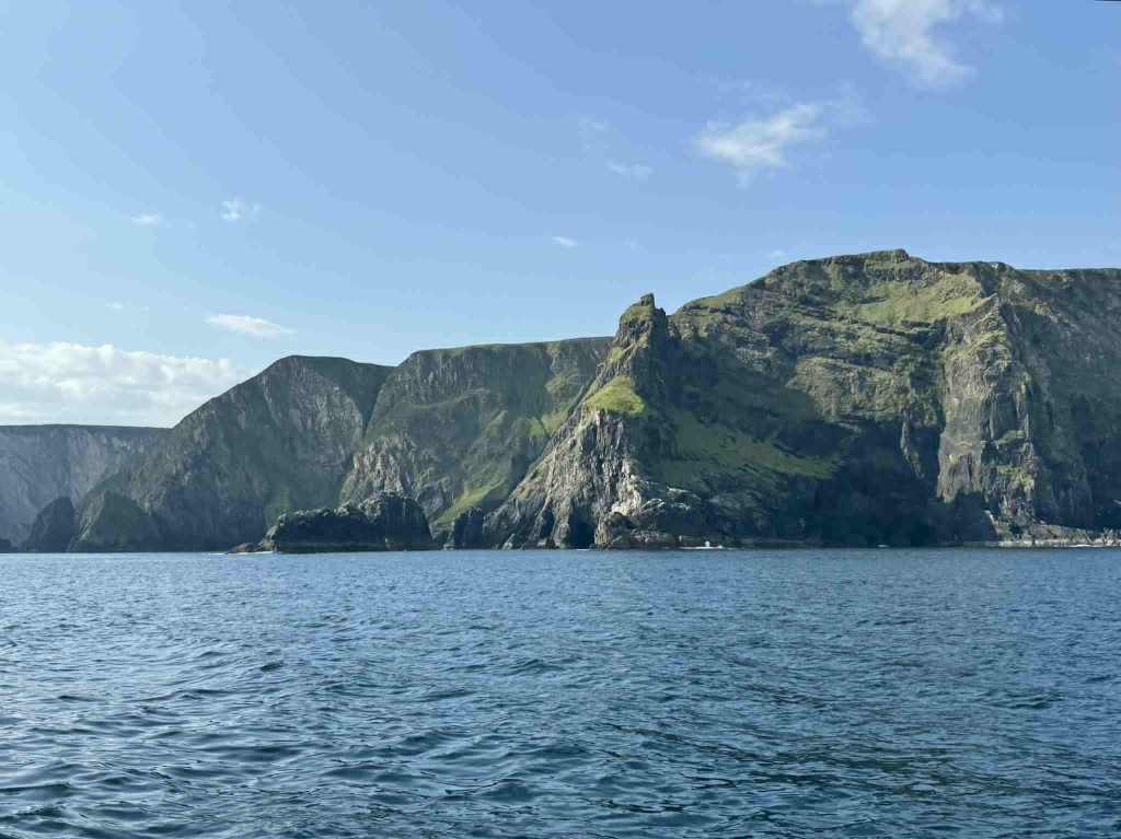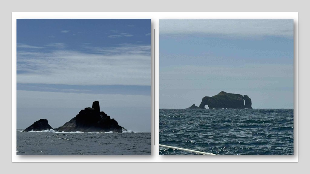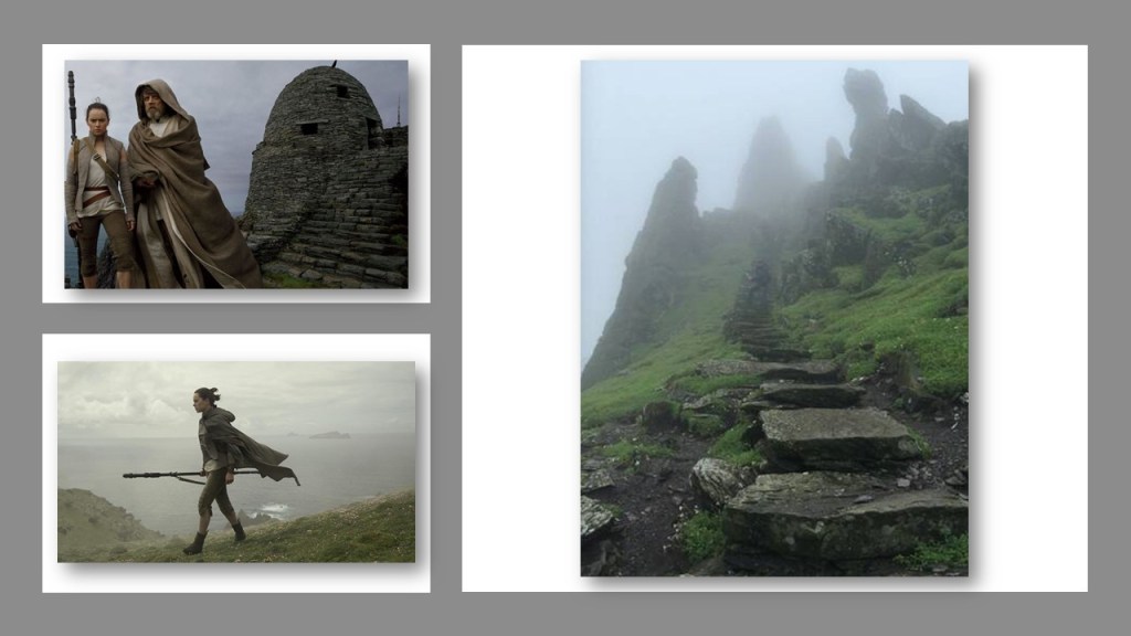 Ce sont. Des îles importantes. Les Skellig Islands. On vous dira, sur les sites touristiques, que ce sont le Joyau de l’Irlande, rien que ça, George Bernard Shaw les a décrites comme un endroit incroyable, impossible et fou, elles ne sont accessibles que par bateau et font la richesse des tour-opérateurs qui embarquent les touristes pour une visite inoubliable, le truc à voir et que nous ne verrons pas ce sont les ruines du monastère sur Skellig Michael, auxquelles on accède par un escalier de 618 marches taillées dans la roche il y a mille ans, ce qui en a fait sa renommée c’est Star Wars, il y a des scènes qui ont été tournées là bas et les gens sont plus intéressés par ça que par les moines, ça arrive souvent que la visite soit annulée à cause de la météo, tu m’étonnes :