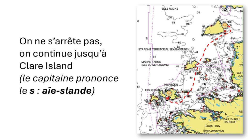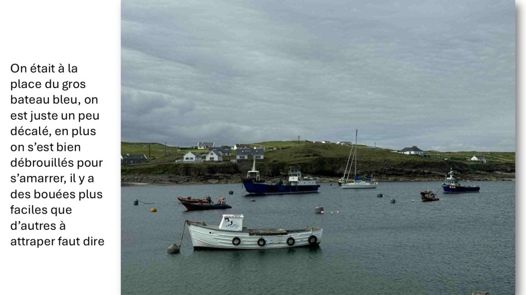 mais la mer finit par se ranger dans l’après-midi, et sur le coup de 18 heures nous arrivons devant l’île Inishmore, prenons une bouée à Kilronan (Cill Rónáin si on préfère), à côté de Boa Vista, le Dufour 445 du GIC (Groupe International de Croisière, association à but non lucratif, qui propose des croisières et des stages d’initiation et de perfectionnement), on les a déjà croisés et déjà vu leur galère pour prendre une bouée, le capitaine n’aime pas se moquer mais bon, il avait été critique quant à leur façon de faire, à nous de montrer ce qu’on a dans le ventre maintenant, bon, aujourd’hui il y a du vent, il y a du courant, on va voir ce qu’on va voir, bon, on loupe la bouée en marche avant alors le capitaine décide de la choper par l’arrière, voilà, on y va à reculons, je suis à genoux sur la jupe avec la gaffe à bout de bras et il s’approche lentement, mais ça foire, c’est trop lentement vu le vent qui pousse le bateau et le courant qui nous dépale, faut recommencer, on y arrive au bout de quoi, 3 fois ? 4 ? En plus, le merdier quand on prend une bouée par l’arrière, c’est qu’après il faut passer l’amarre à l’avant, et quand le vent et le courant poussent le bateau, il faut des bras et des dos qui assurent, on y arrive en ahanant, on a de l’entraînement mais on n’a plus vingt ans, malgré ce constat tacite l’ego du capitaine en a pris un sale coup, il déteste, il dé-teste ! passer pour un clampin. Moi ça va, je suis tolérante avec moi et avec les autres, la vie n’est pas un test d’excellence, que celui qui n’a jamais dû s’y reprendre pour attraper une bouée nous jette la première pierre à Boa Vista et à nous. Pour autant ce n’est encore pas terminé, il faut mettre l’annexe à l’eau pour finir de s’amarrer comme il faut sur cette bouée, alors annexe à l’eau, le capitaine y va tandis que j’attends ses ordres sur le pont, une alarme stridente se déclenche, c’est quoi ce binz ? je fonce à la table à carte voir ce qui se passe, les écrans clignotent et ça gueule à me vriller les tympans, ça clignote homme-à-la-mer ! homme à la mer ! dans tous les sens, le plus simple et le plus rapide c’est d’éteindre les instruments, j’éteins tout , ce qui me permet d’entendre le capitaine m’appeler pour venir l’aider, mais qu’est-ce que tu fabriques ?! Je fabrique qu’il fallait bien éteindre cette alarme, quelle alarme ? Au bout du compte il est tout content de voir que l’alarme homme-à-la-mer fonctionne bien, c’est parce qu’il s’est éloigné du bateau avec la télécommande du pilote autour du cou que ça s’est déclenché, c’est bien, au moins si ça lui arrive de tomber pour de vrai à l’eau tandis que je dors, je serais réveillée en fanfare.