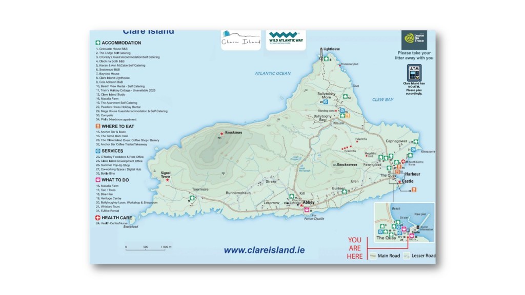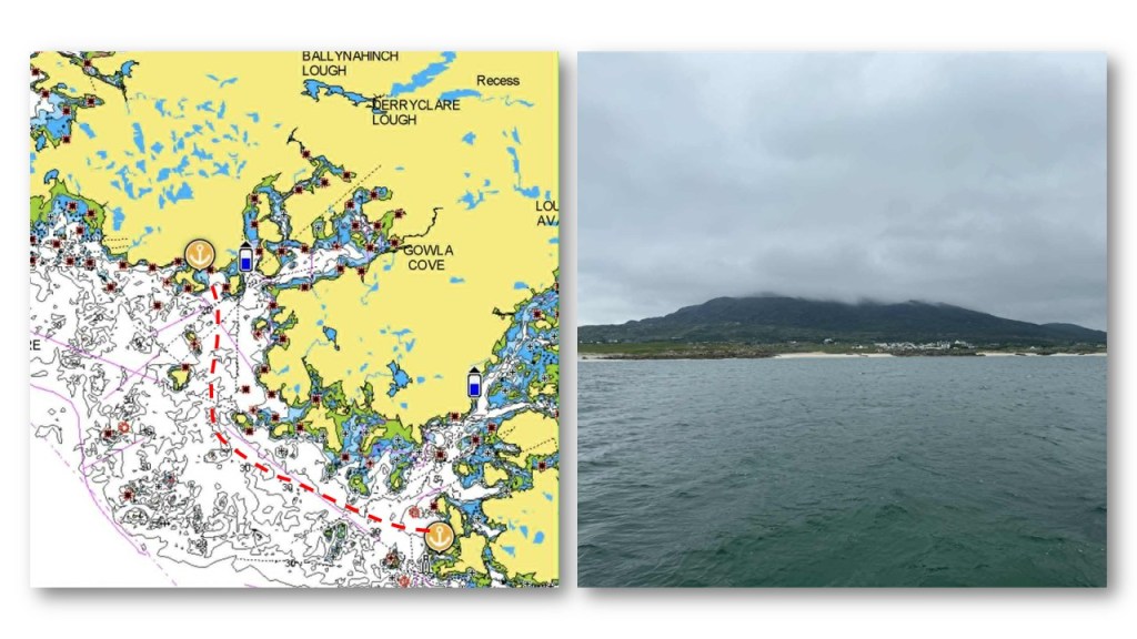 Ce ne sont pas des escales où l’on s’attarde, par contre on a prévu de se balader lors de la suivante, sinon à quoi ça sert, on ne fait pas le Vendée Globe quoi, Inish Bofin (Inis Bó Finne, l’île de la vache blanche) à 26 NM de là, on tournicote dans le mouillage parce qu’il n’y a guère de fond, un pêcheur nous indique une grosse bouée jaune où se mettre (du premier coup) on est parfaitement protégés, le capitaine est content.