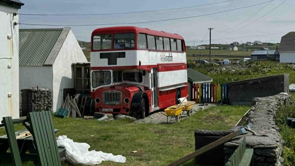 Ça nous plombe de l’apprendre même un siècle plus tard, nous nous remettons en marche le pas lourd, comment ne pas imaginer la terreur de ces pêcheurs pris dans cette tempête, le genre de truc pour lequel un journaliste ne peut faire qu’une transition hasardeuse pour remettre les pieds dans la vraie vie, et pour nous la vraie vie ici et maintenant c’est que nous avons faim, nous avons vu, sur les mêmes dépliants qui vantent l’île, qu’il n’est tout bonnement pas possible de ne pas aller se restaurer dans le bus-restaurant Inishwallah, soit, vendu, nous reprenons du poil de la bête à cette idée, déception, il est fermé.