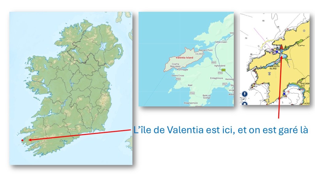 Par ce beau temps, donc, nous sommes partis de Derrynane Harbour, direction Valentia Island, quand je regarde la carte je me dis que bon sang on n’est pas prêts d’arriver aux Féroé, parfois je me demande si j’aurai la couenne d’aller jusque si haut, on se trouve à 51°54′ Nord, il fait fort frisquet et la mer c’est tsoin-tsoin, et il faudra remonter encore de 10 degrés, on n’est pas rendus …