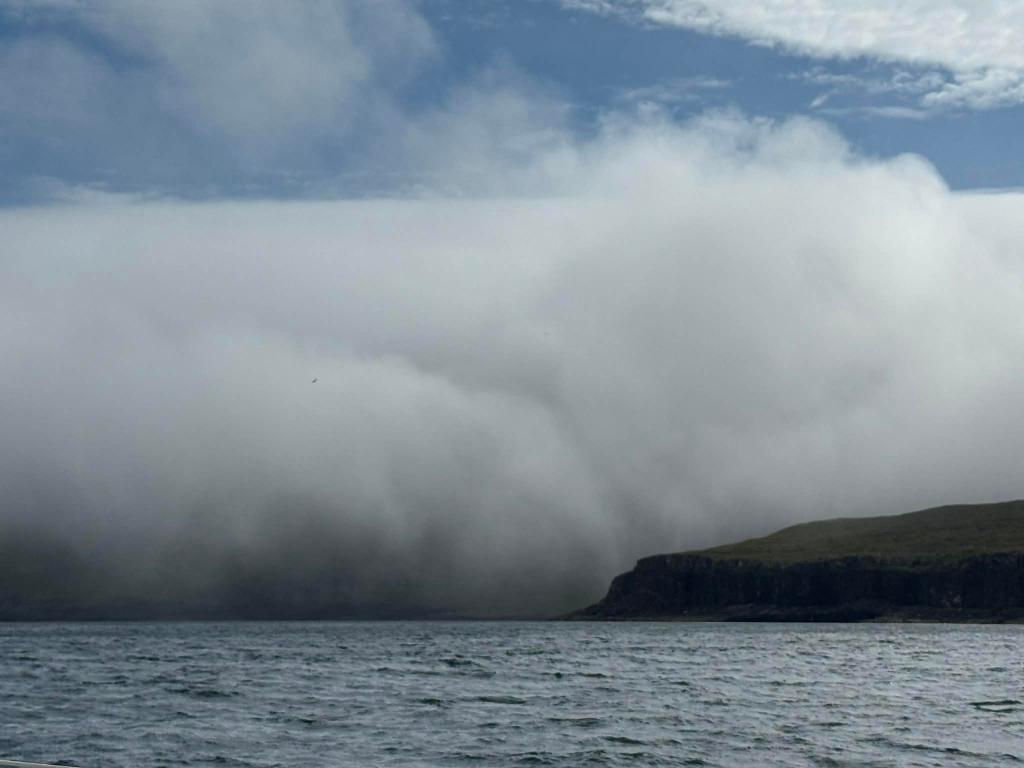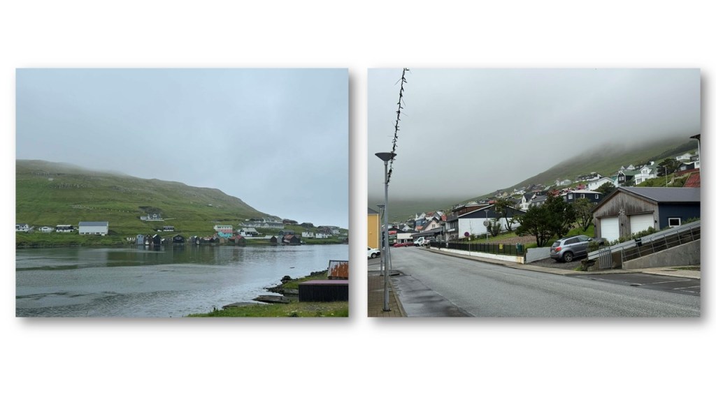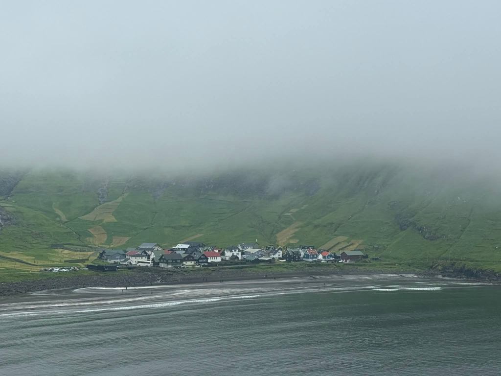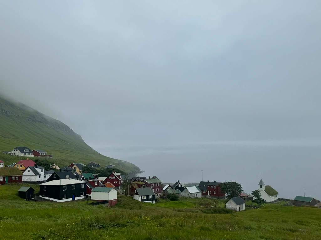 9 juillet, en arrivant sur l’île Suðuroy, la plus Sud des Féroé, on se dit qu’on va être engloutis par cette masse nuageuse, je retiens ma respiration comme si on allait être irradiés, et puis non, en tous cas j’ai toujours mes mains, mais on a tout de même plus qu’un peu l’impression d’arriver sur une île fantôme … quand des maisons surgissent du nuage, soulagement, il y a de la vie,