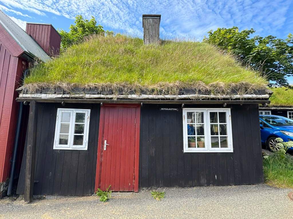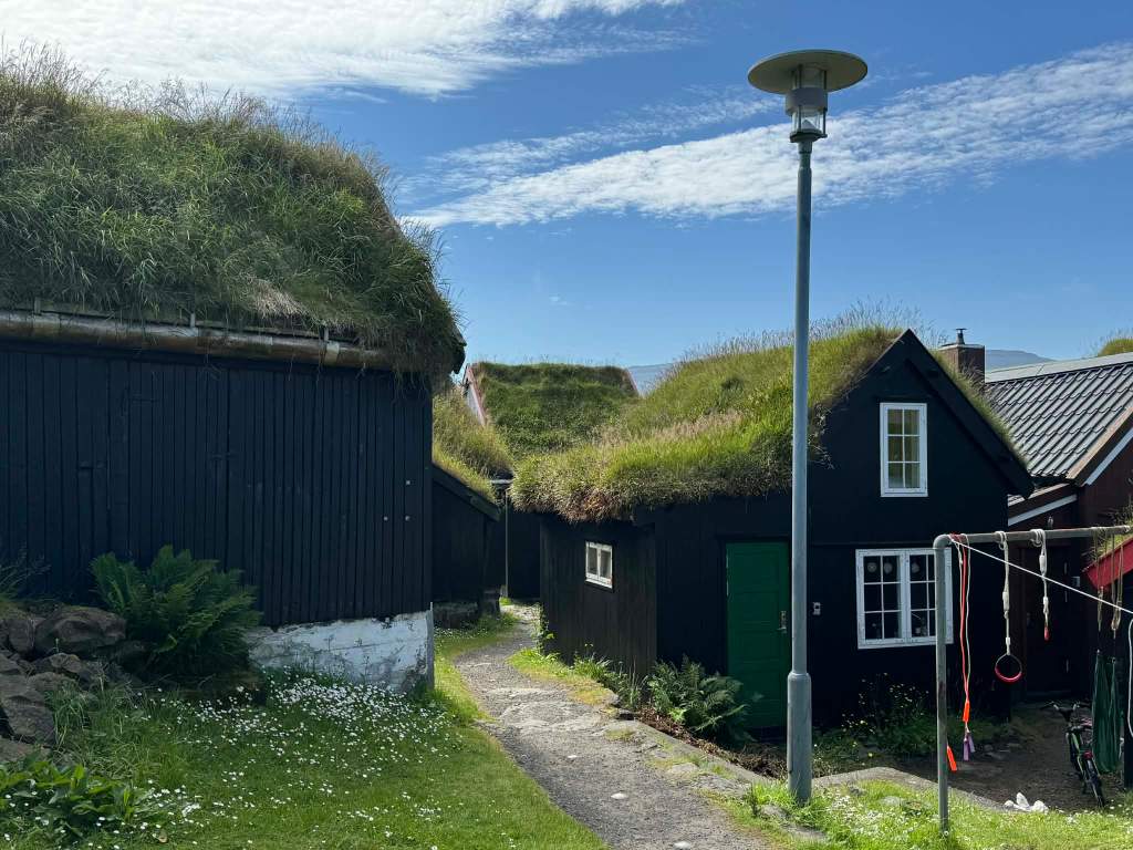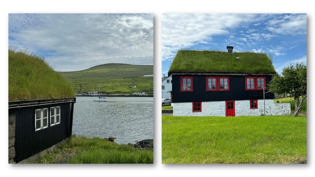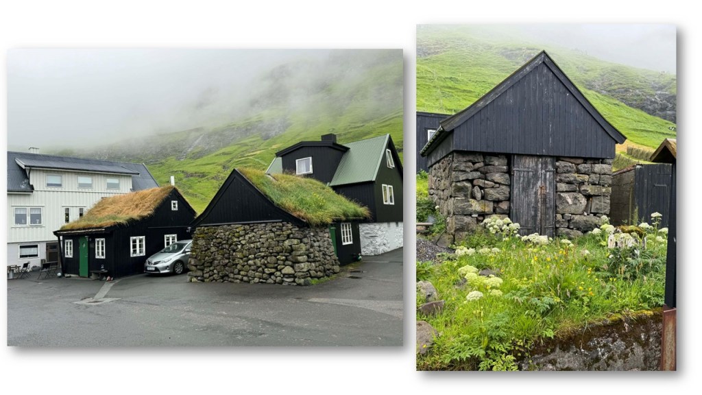 Voir ses maisons aux toits de tourbe recouverts d’herbe, mode qui date de l’époque Viking au 9ème siècle, les plus anciennes ont 3 ou 400 ans, et maintenant ceux qui utilisent cette méthode mettent une couche de plastique sous la tourbe, il pleut plus de 300 jours par an ici, c’est pour ça :