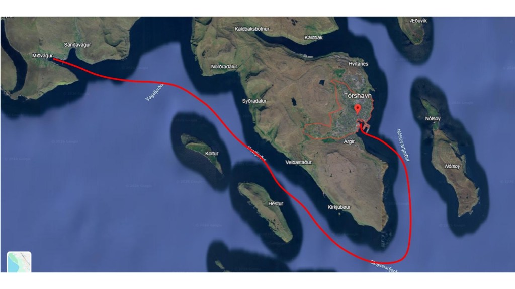 On change d’île dès le lendemain, pour la capitale des Féroé, à savoir Tórshavn, sur l’île de Streymoy, une vingtaine de miles à faire, on suit cette route :
