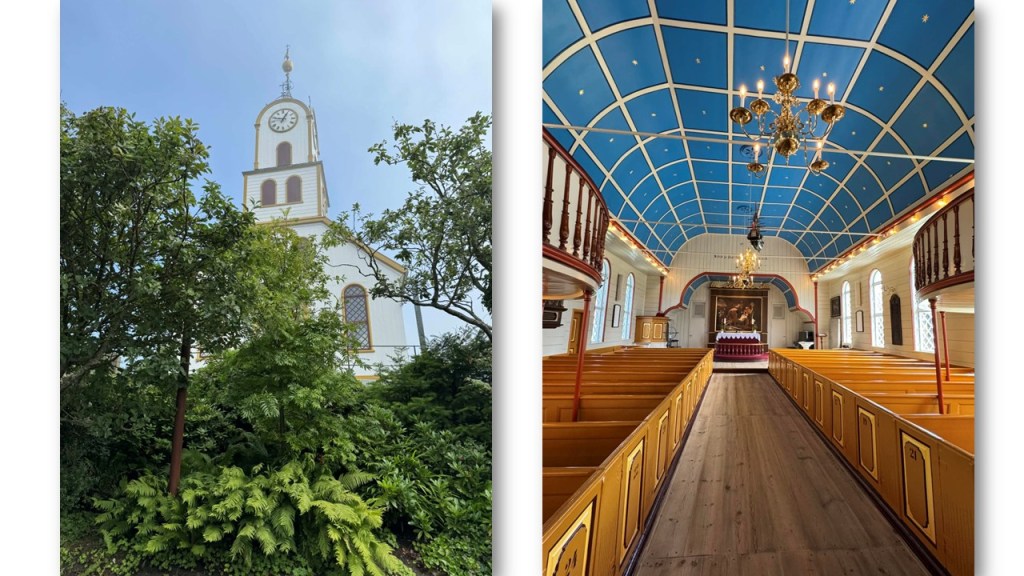 Sa cathédrale construite en 1788, de culte luthérien, avec son ciel étoilé et ses maquettes de bateaux suspendues :