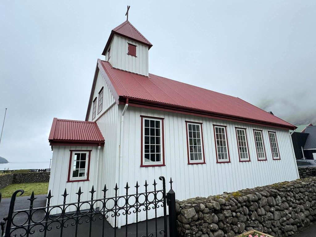 Tjørnuvík, sur la côte nord-est de Streymoy, connu pour sa petite autant que rare plage de sable, ses 64 habitants et sa petite église qui date de 1937 :