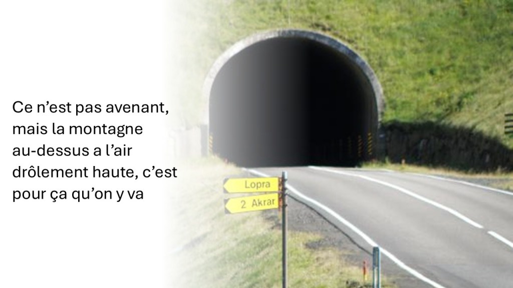 Avec le capitaine, on n’a pas de lumière, ni sur les vélos, si sur nous, et parfois celle de ma cervelle ne fait que clignoter poussivement comme on le sait, le tunnel est froid, humide, noir comme dans un cul, heureusement qu’il n’y a que peu de circulation et que je ne souffre pas d’incontinence fécale, le bon côté c’est que je pédale vite pour en sortir au plus tôt, 3240 mètres, j’ai l’impression que ça dure 20 kilomètres, quand on en ressort le capitaine me dit qu’on prendra la route pour revenir, je signe de suite.