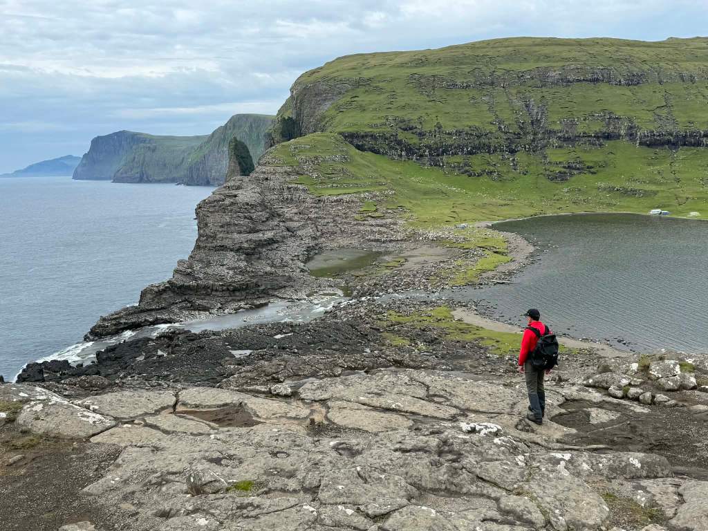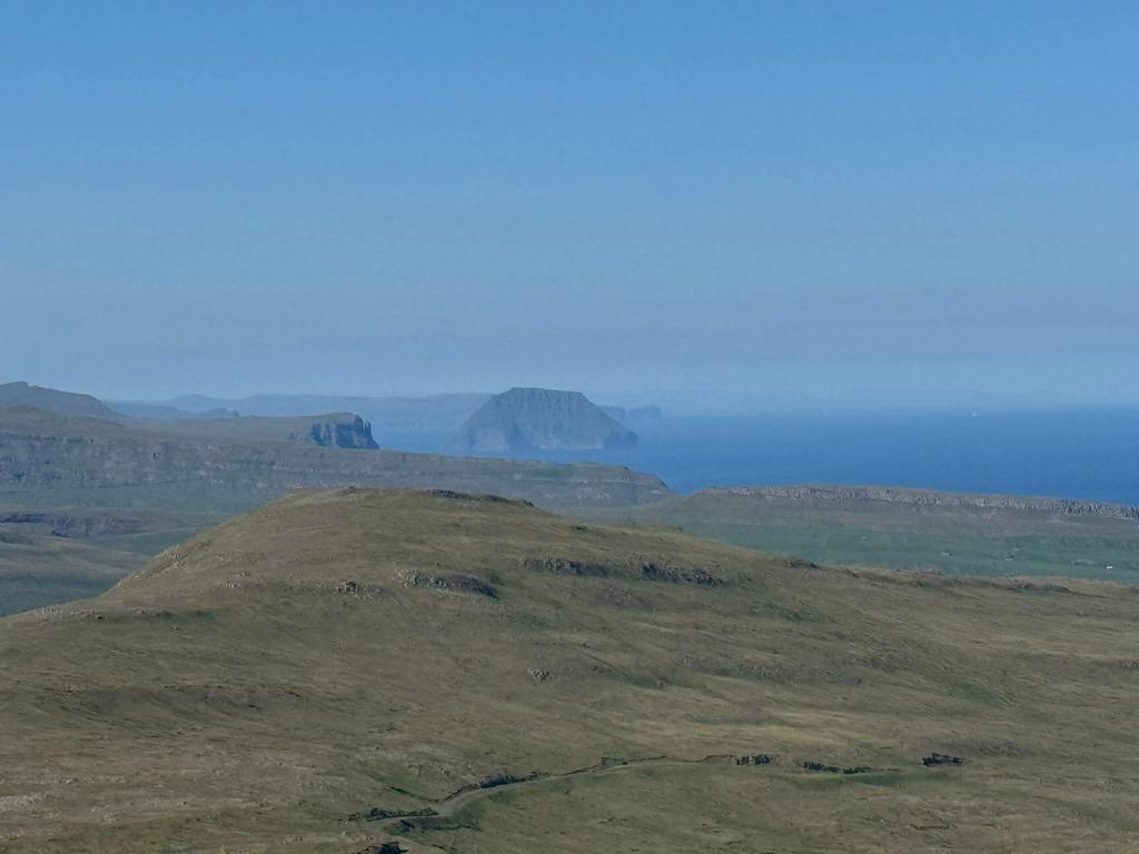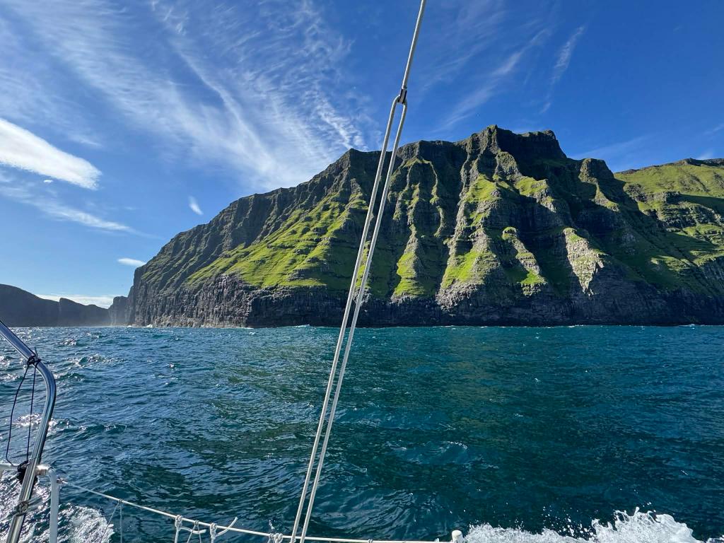 Pour autant, il faut se lever le lendemain puisqu’on a 42 NM à faire pour rejoindre Miðvágur sur l’île de Vágar, à ne pas confondre avec Vágur sur l’ile Suðuroy, que nous venons de quitter, si vous confondez je ne vous en tiendrai pas rigueur, coup de pot encore une fois, il fait grand beau et je vous fais profiter du paysage vu de la mer, plutôt rare parce que les guides ou blogs qui font visiter les Féroé ne le font pas à bord d’un voilier, vous êtes vernis.
