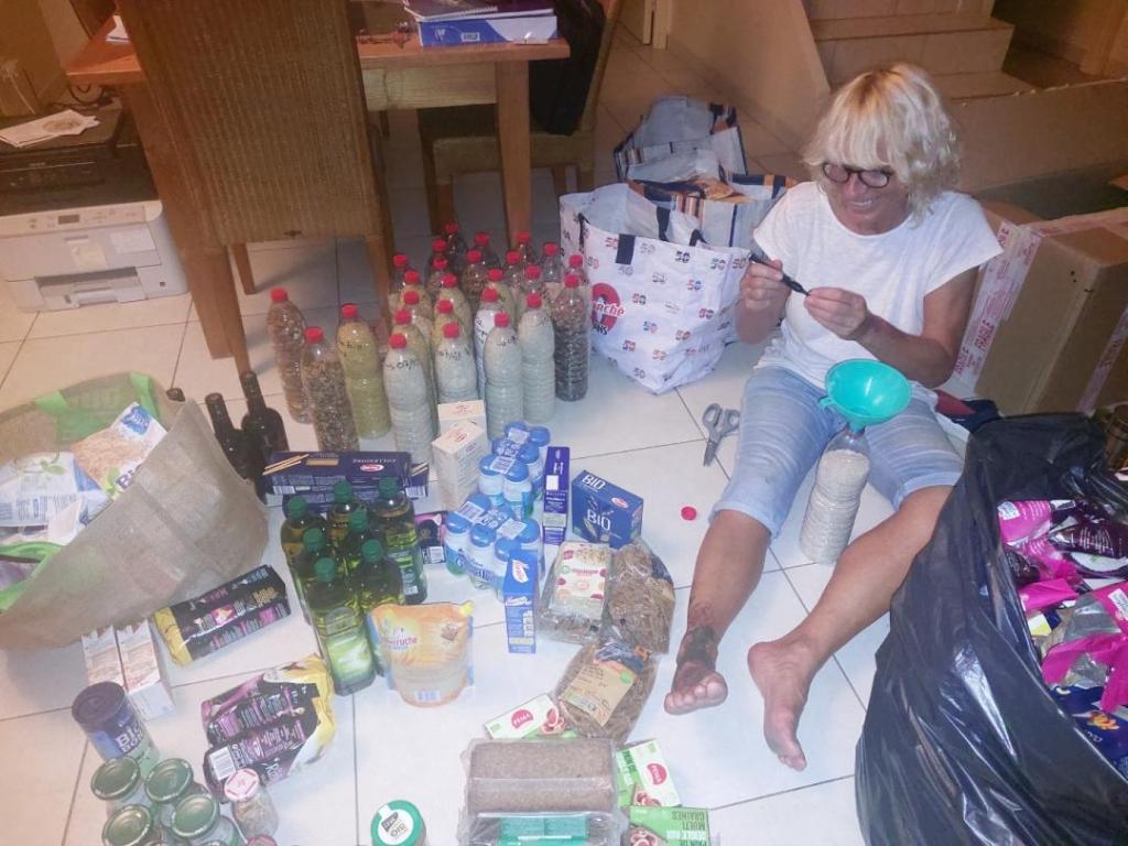 et puis surtout, à manger (l’astuce du jour : pour ne pas tomber malade, manger c’est la base) : j’ai couasiment tout mis dans des bouteilles en plastique, heureusement que je suis là sinon ce bon capitaine n’aurait mangé que des pâtes de blé raffiné, du riz et des sardines en boite pendant des mois, aurait perdu ses dents et sa noblesse par la même occasion, (Stanislas, mon petit-fils de 5 ans, me réclame des nouilles et non de vulgaires pâtes, parce que les nouilles de mamie elles ont quelque chose de spécial que les pâtes n’ont pas), j’ai donc fait le plein de riz noir, rouge, complet, quinoa, boulgour, lentilles, amandes, noix diverses, et puis des farines de ceci et de cela pour faire du pain à bord … on est paré, en plus du panneau « acupuncture » dans les ports, je pourrai en faire un « petite épicerie bio »