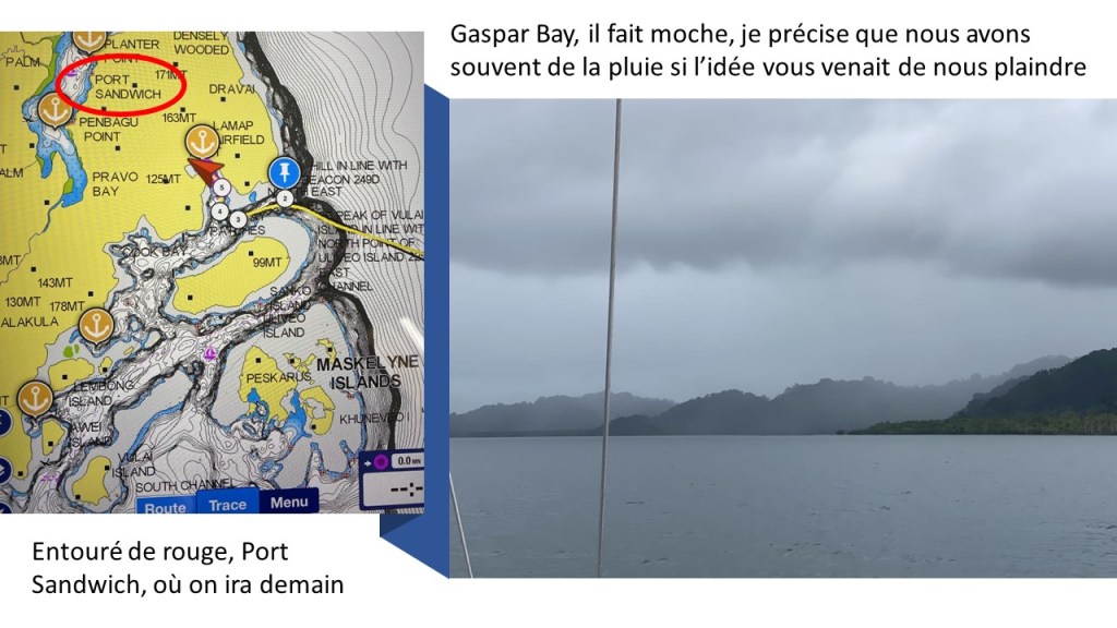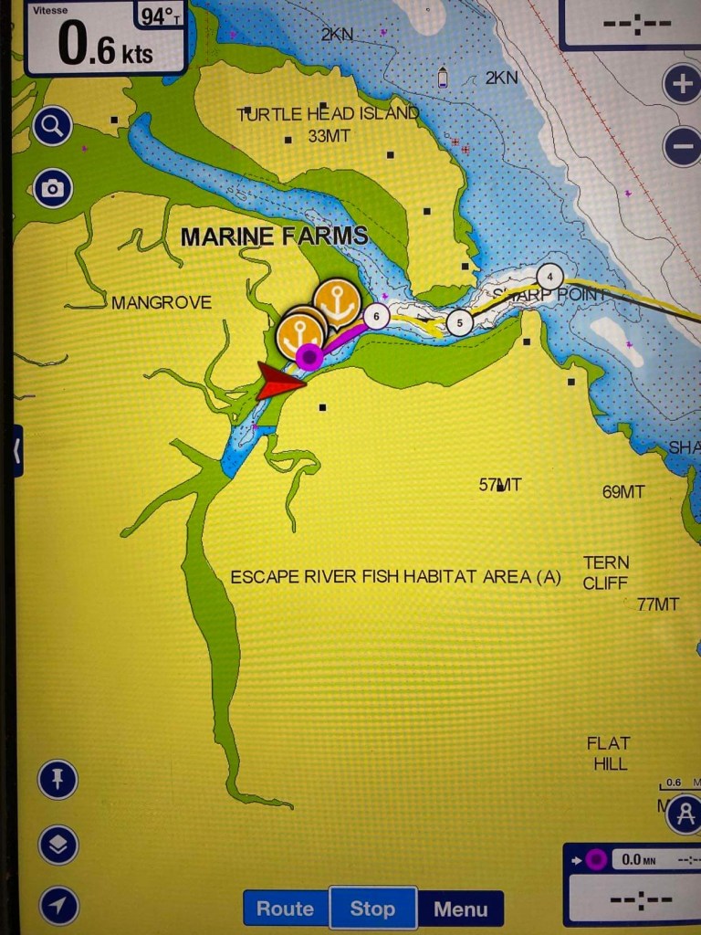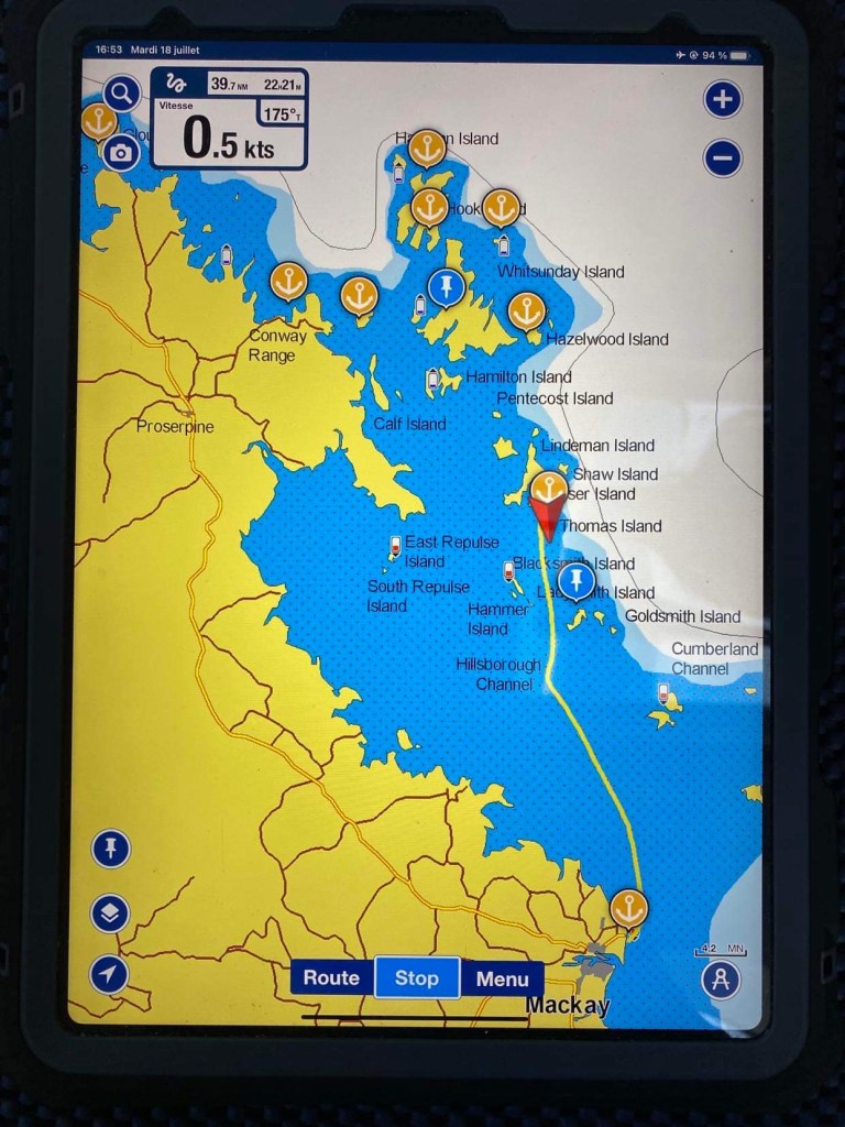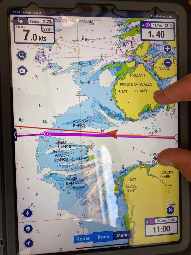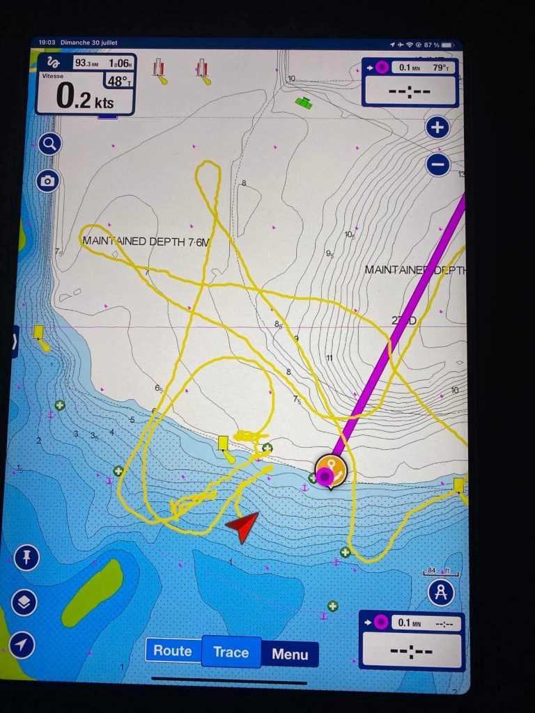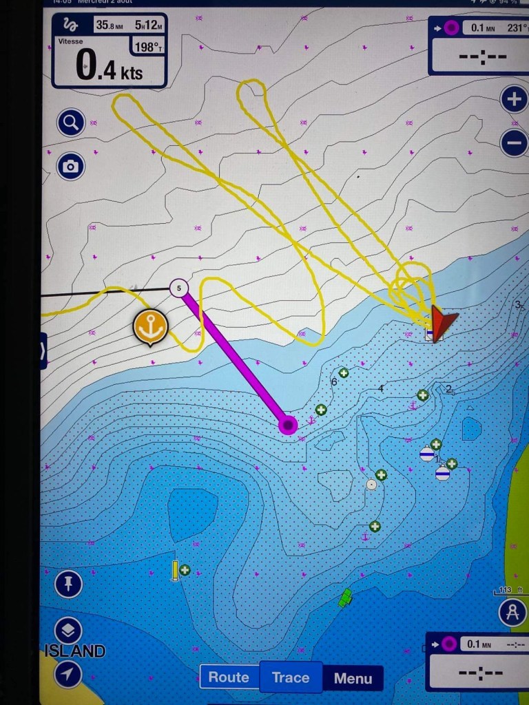 – ça fait encore 3 heures de nav jusqu’au point de mouillage !