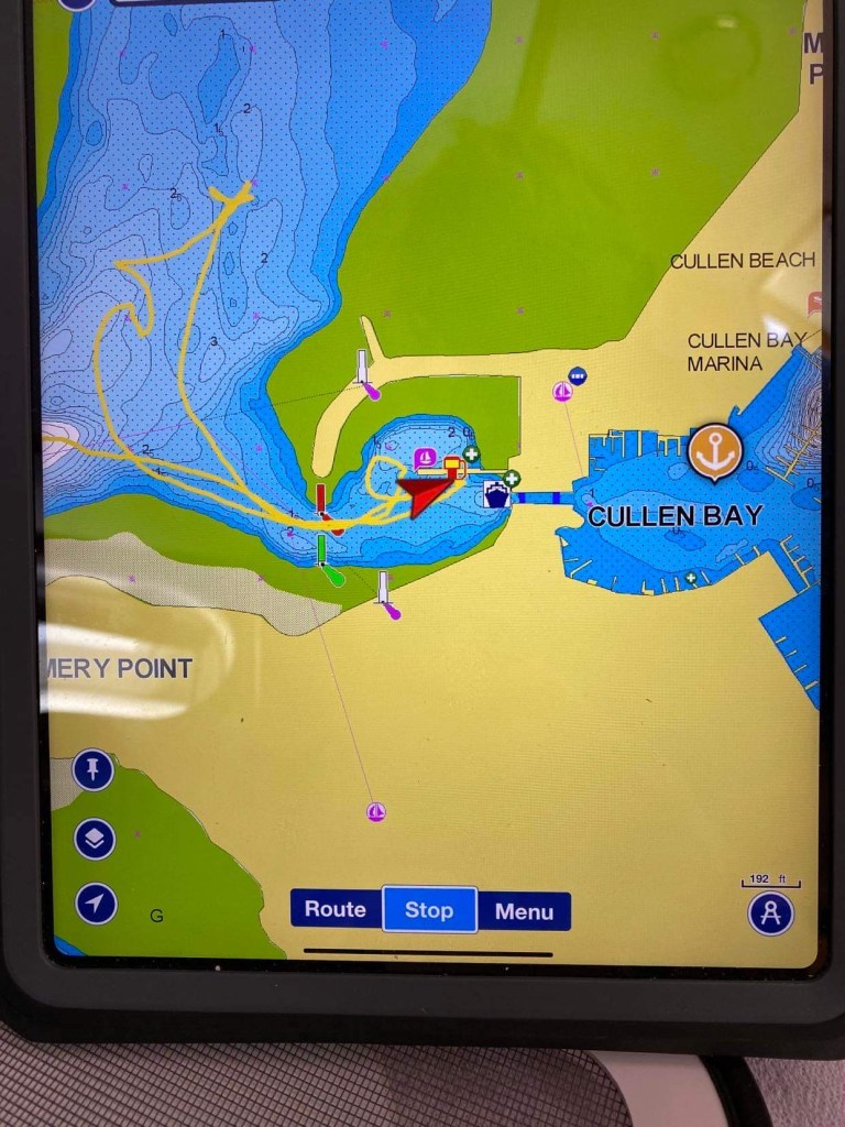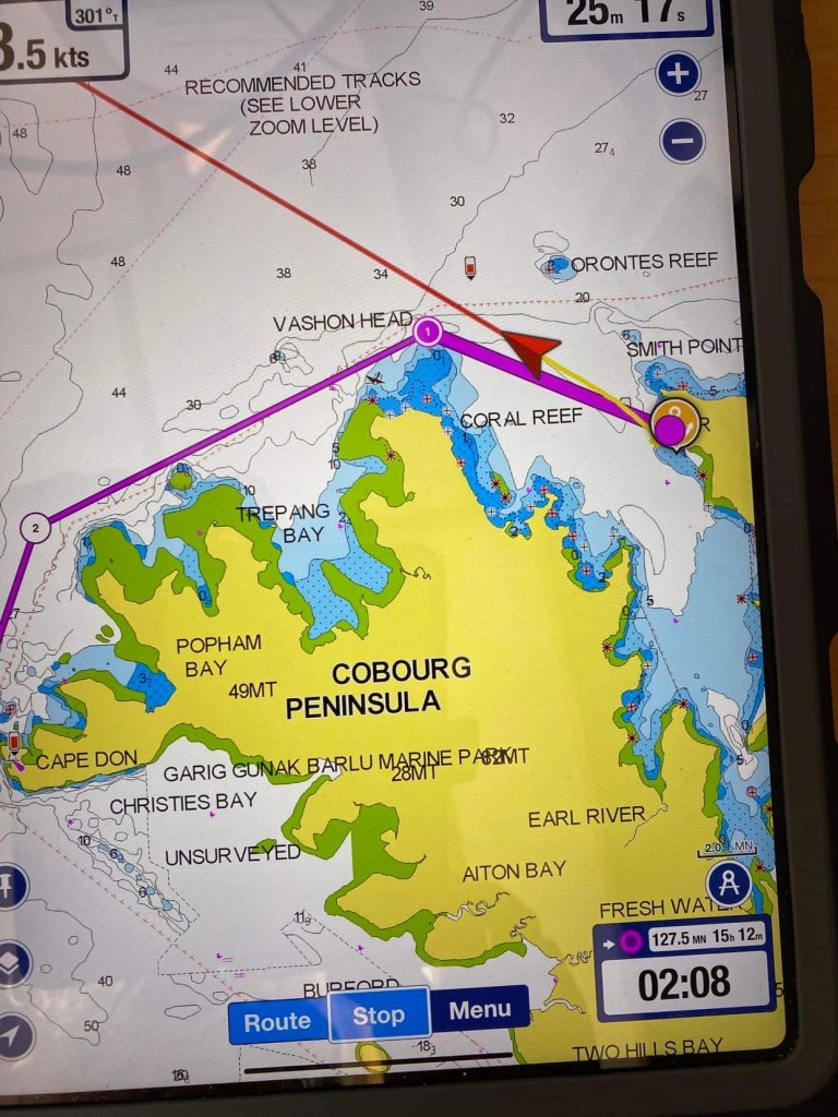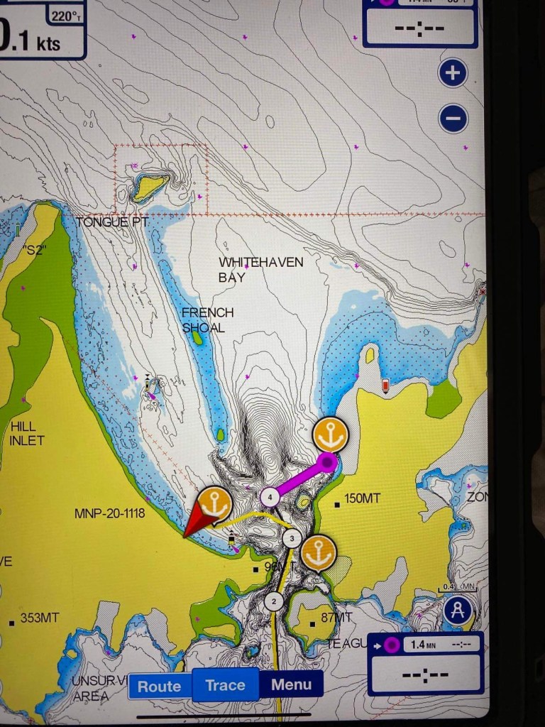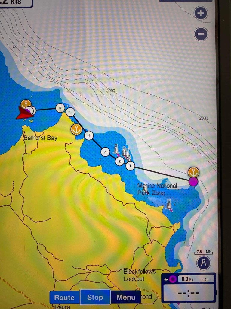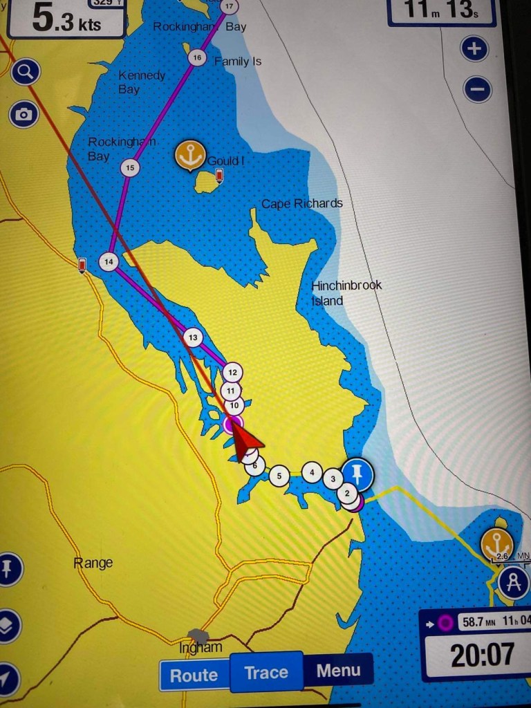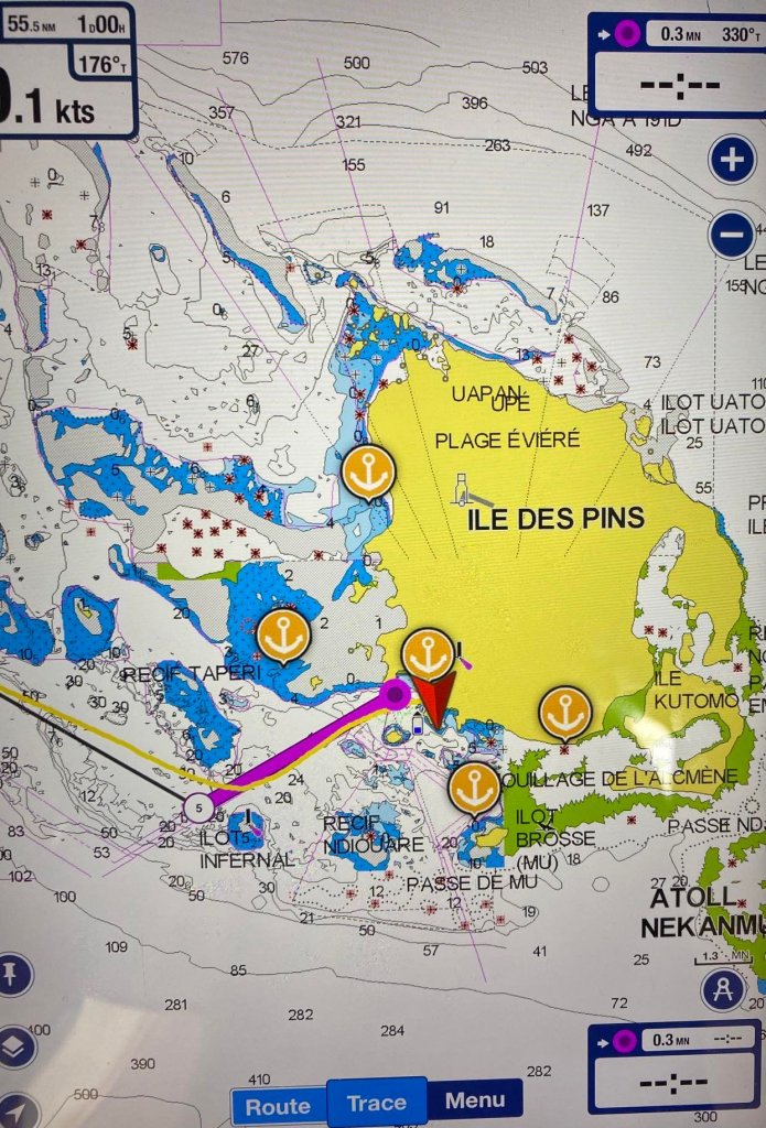 – ça fait encore 3 heures de nav jusqu’au point de mouillage !