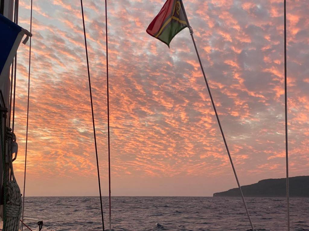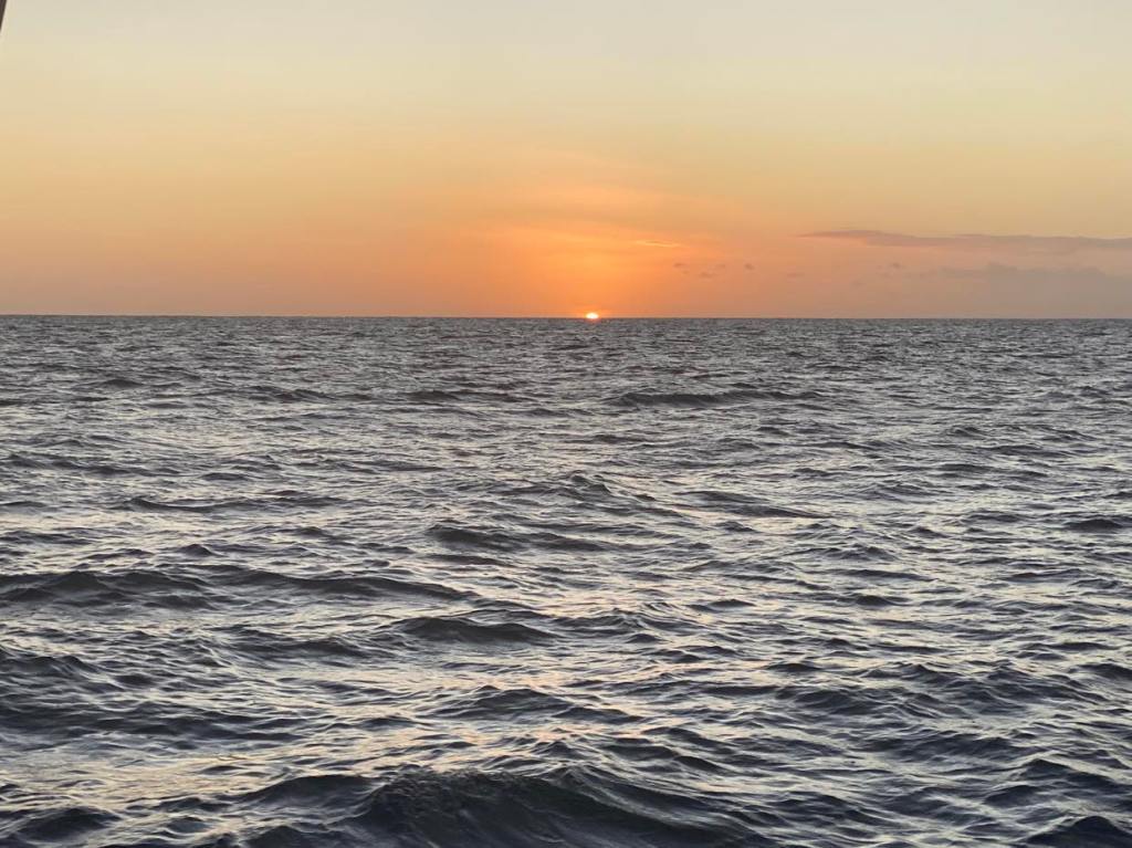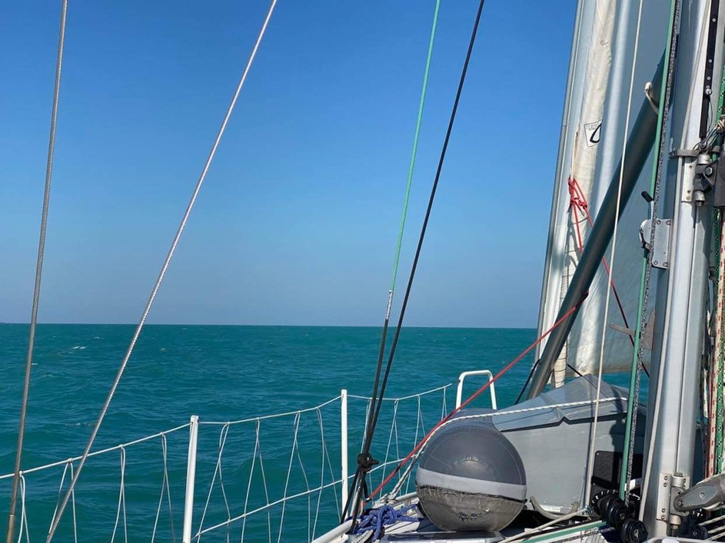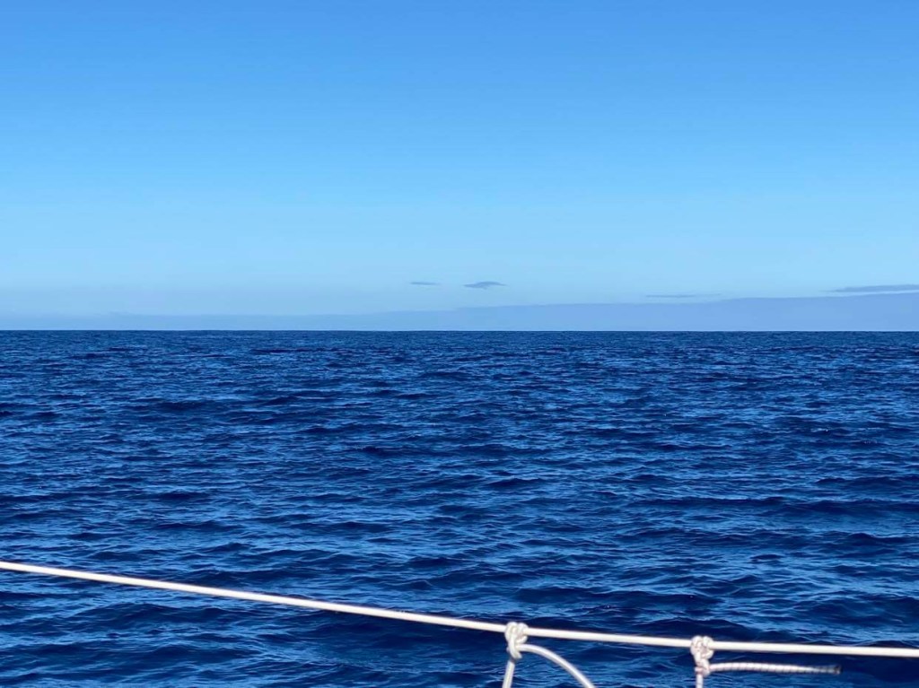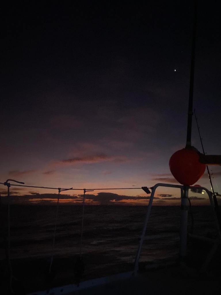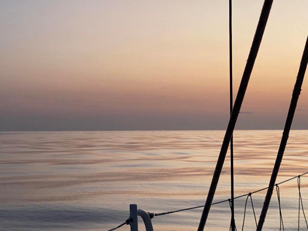Dimanche 1er octobre, on a dû affaler et mettre le moteur à 5h du mat’ et après une journée de pétole on a pu à nouveau hisser les voiles sur le coup de 17h, c’est reparti avec 10/12 nœuds de vent à 70 degrés, on file à 7,5 sous GV et génois.