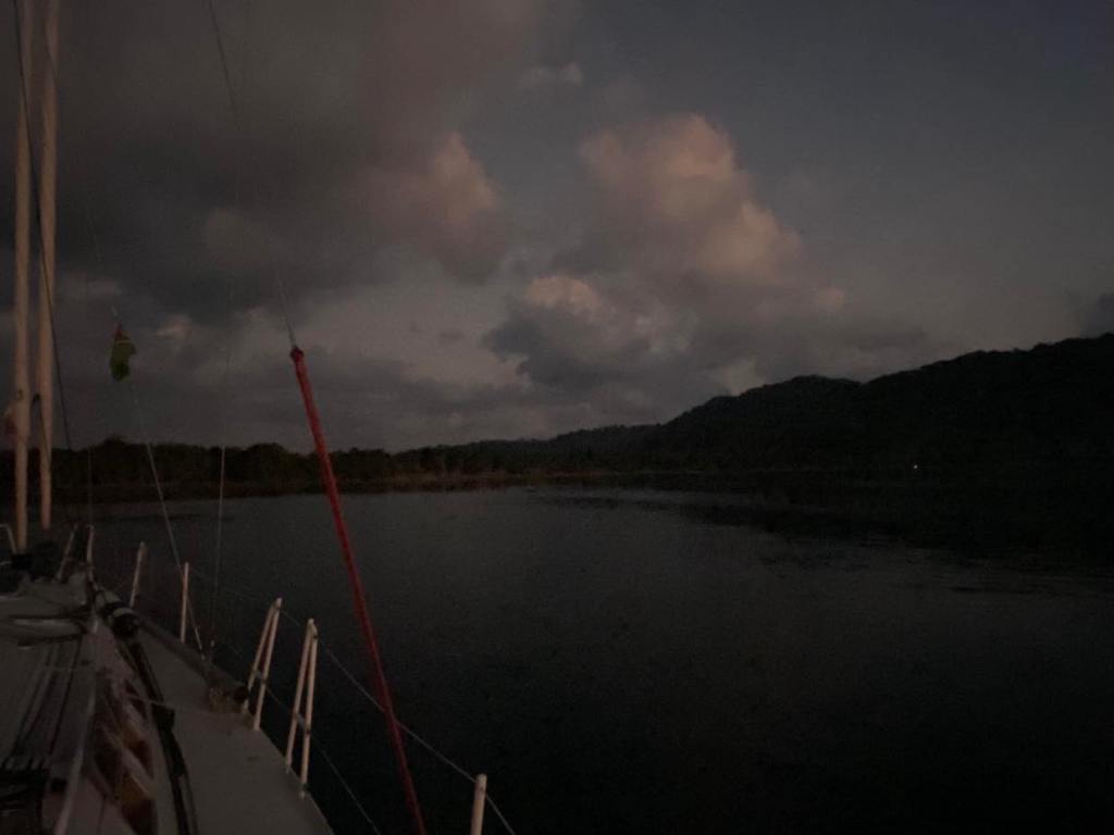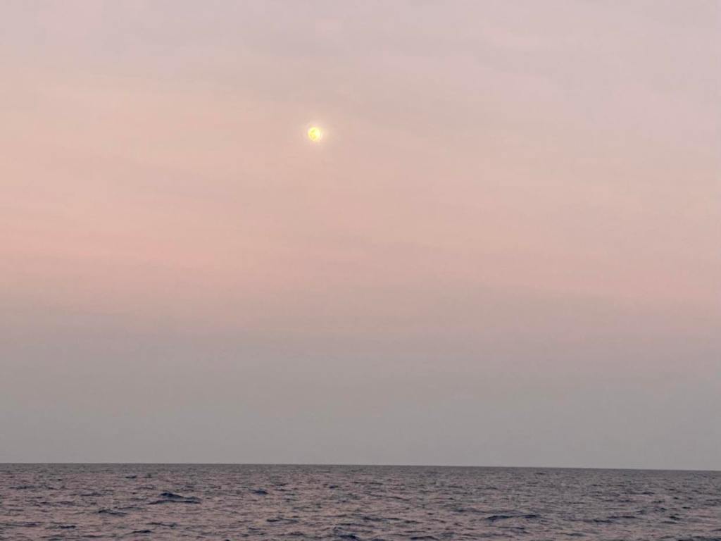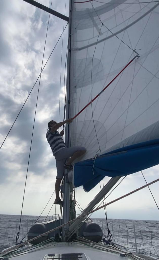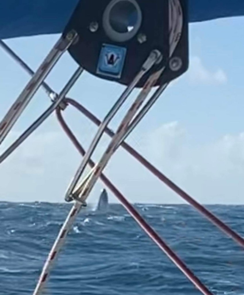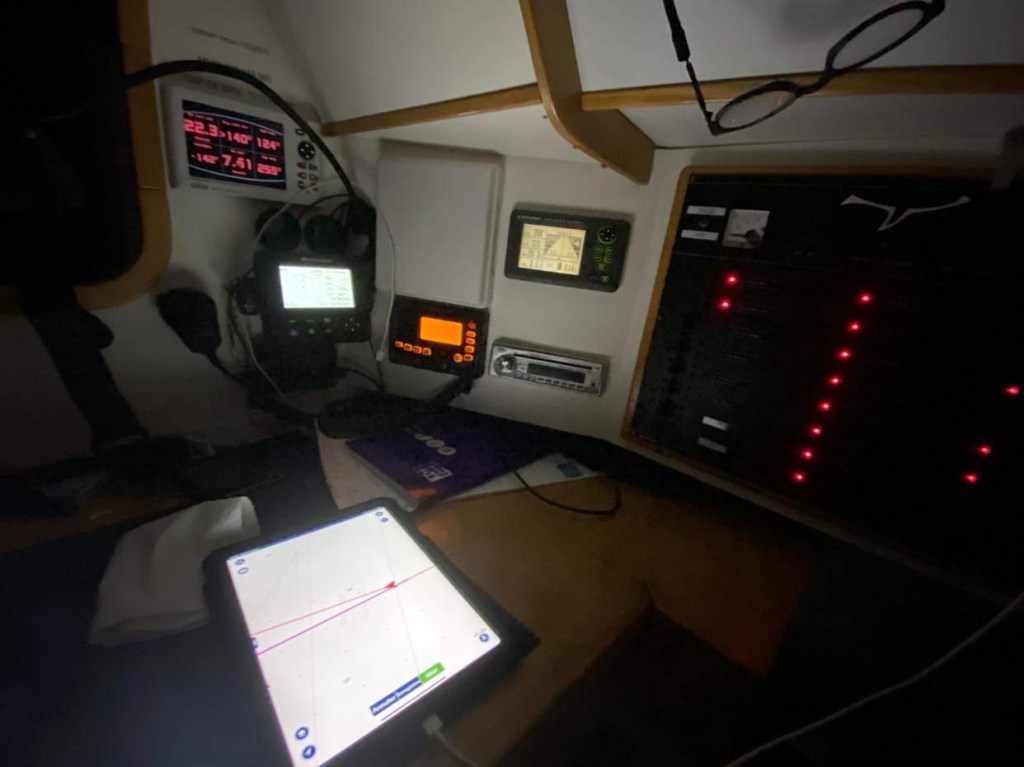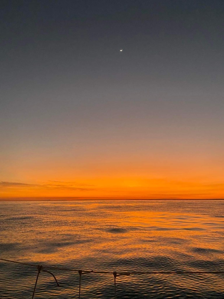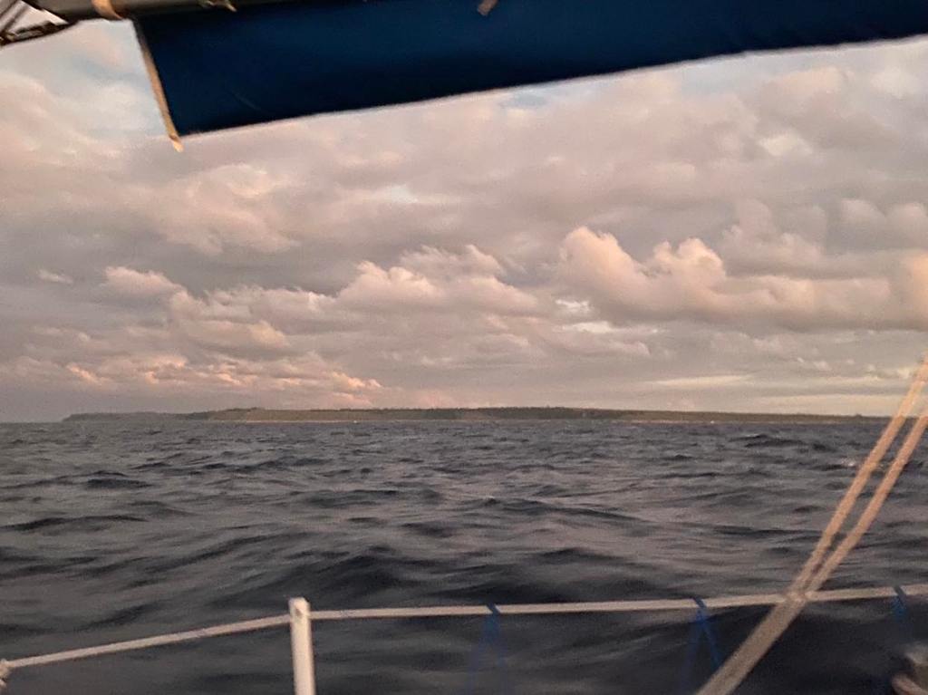 Dimanche 1er octobre, on a dû affaler et mettre le moteur à 5h du mat’ et après une journée de pétole on a pu à nouveau hisser les voiles sur le coup de 17h, c’est reparti avec 10/12 nœuds de vent à 70 degrés, on file à 7,5 sous GV et génois.