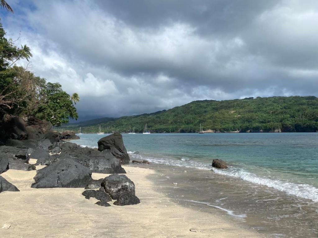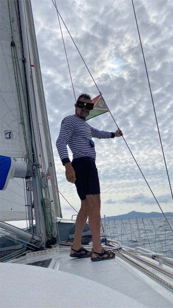 Il fait beau et chaud, peu de vent sous le vent de l’île bien que nous ayons eu de belles rafales dans tous les sens en hissant la GV :