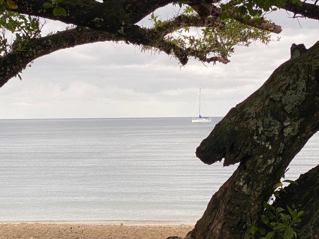 Au bout de 70 heures de nav’, soit moins de 3 jours, ce qui démontre une bonne moyenne c’est pour ça que je précise, on est mouillés devant Direction Island, une des îles des Cocos, tranquille bien qu’on ait eu du vent à 20/22 pour remonter la GV afin de lâcher les 2 ris qu’on avait pris et l’affaler dans la foulée, et bien également qu’on ait dû surveiller les fonds pour ne pas se planter vu que c’était marée basse et plein de patates de corail, des pointes noires viennent tourner autour du bateau, des fois qu’on balancerait de la bouffe, je ne crois plus que c’est pour nous dire bonjour, c’est dommage :