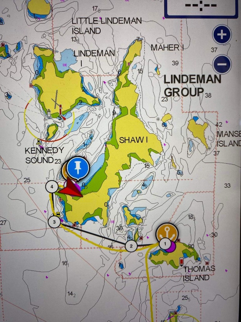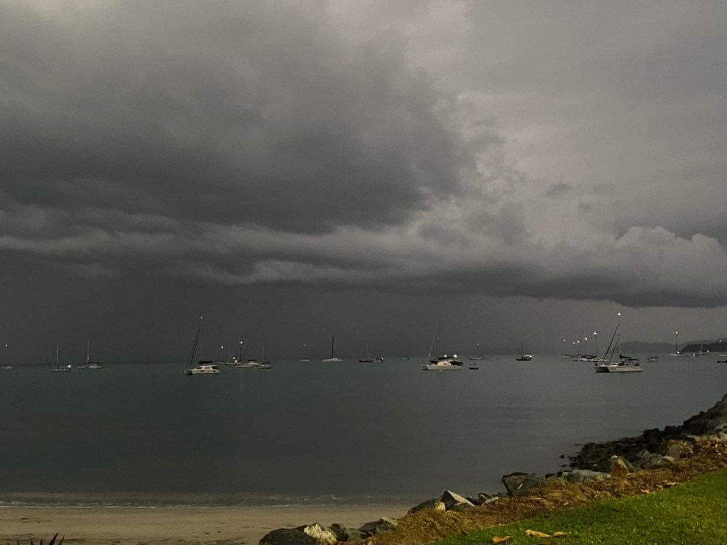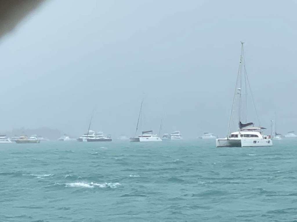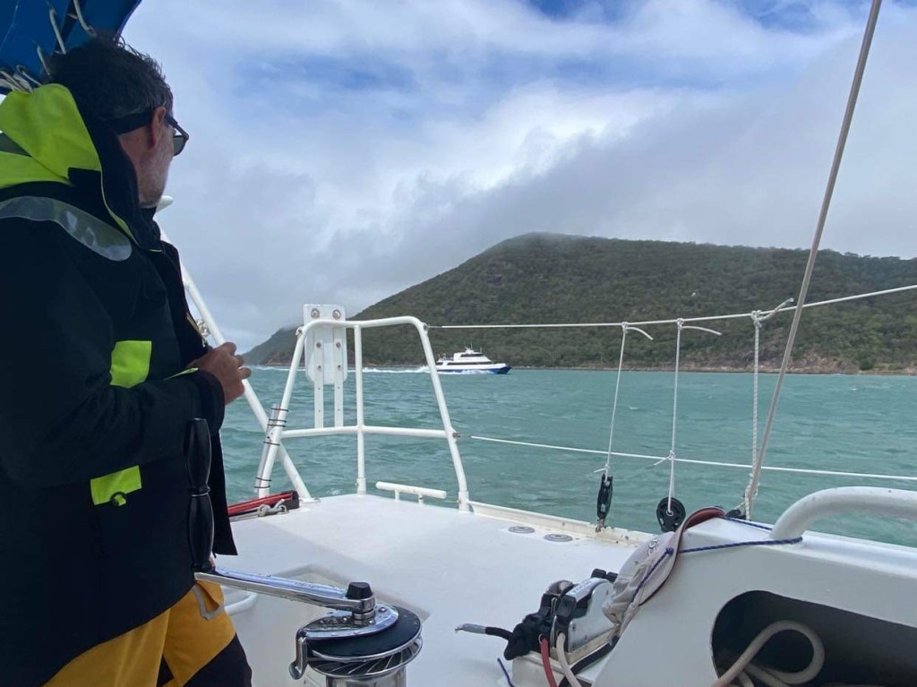 On nous appelle à la VHF, c’est Cap York, on le voit qui arrive dans notre dos, un navire militaire, ils viennent même nous montrer quelle bouée prendre dans le mouillage, top 👍 y’a plus qu’à attendre le vent.