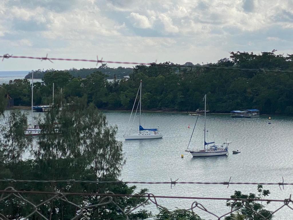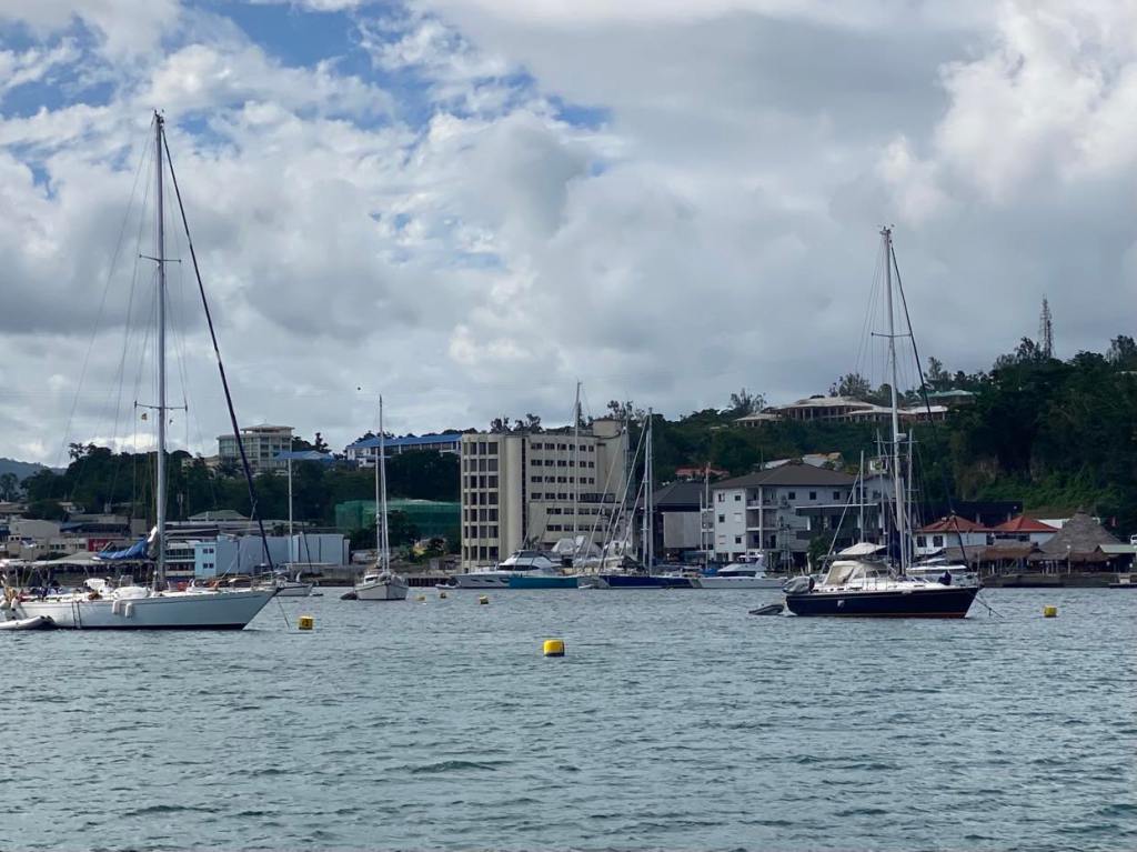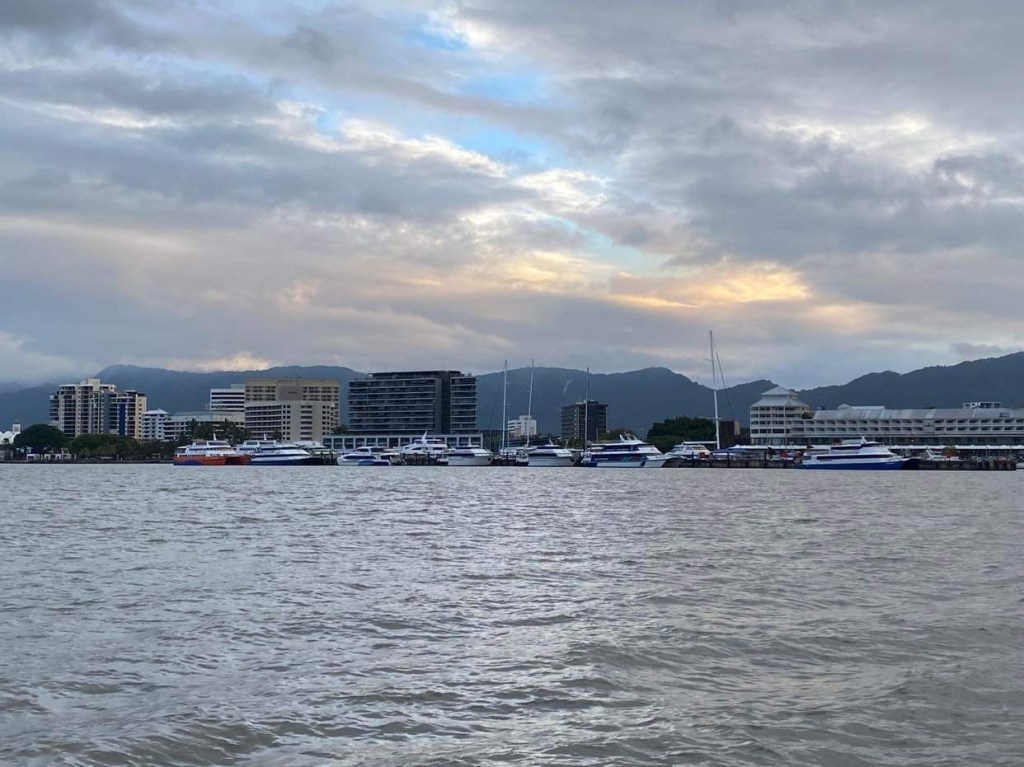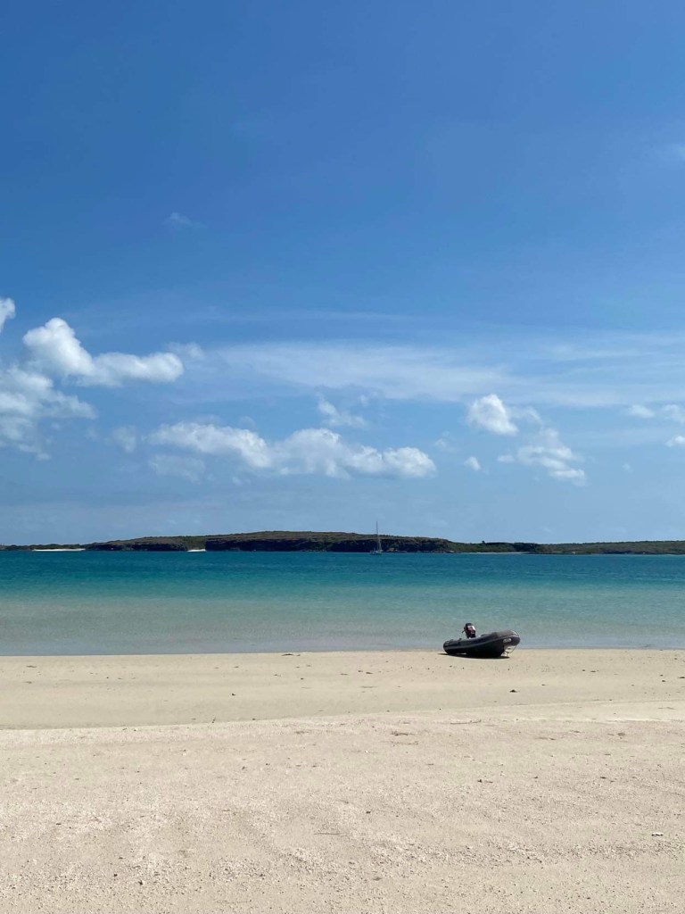 On nous appelle à la VHF, c’est Cap York, on le voit qui arrive dans notre dos, un navire militaire, ils viennent même nous montrer quelle bouée prendre dans le mouillage, top 👍 y’a plus qu’à attendre le vent.