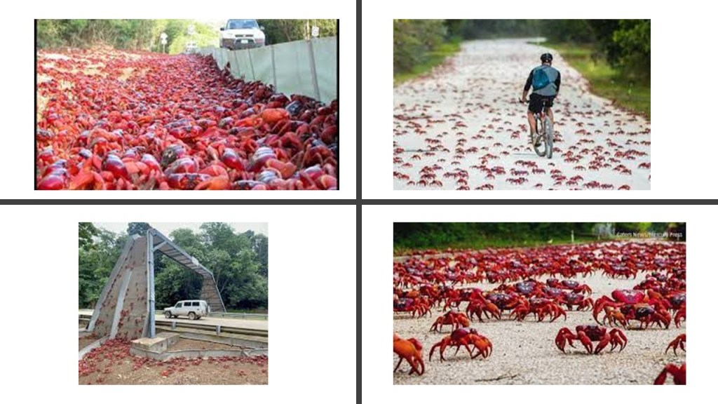 Chaque année, au début de la saison des pluies, des millions, des mi-llions ! de crabes rouges (Gecarcoidea natalis) traversent la petite île pour se reproduire et pondre leurs œufs dans la mer. Ces larves ainsi libérées, servent de festin aux requins-baleine et aux raies manta, 14 espèces de crabes et environ 45 millions de crabes rouges endémiques vivent sur Christmas Island.