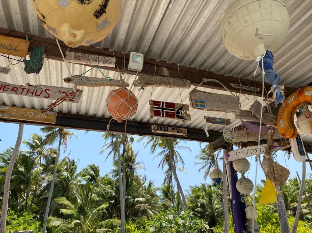 Le soir on retrouve Cécile et Jo de Maeva, on ne se reverra pas car ils filent sur La Réunion alors que nous irons sur les Seychelles, on fait la fête avec des steaks, on n’est pas prêts de remanger de la viande, avant de partir, le lendemain on fait un saut sur Direction Island, on voit les souvenirs laissés par des navigateurs