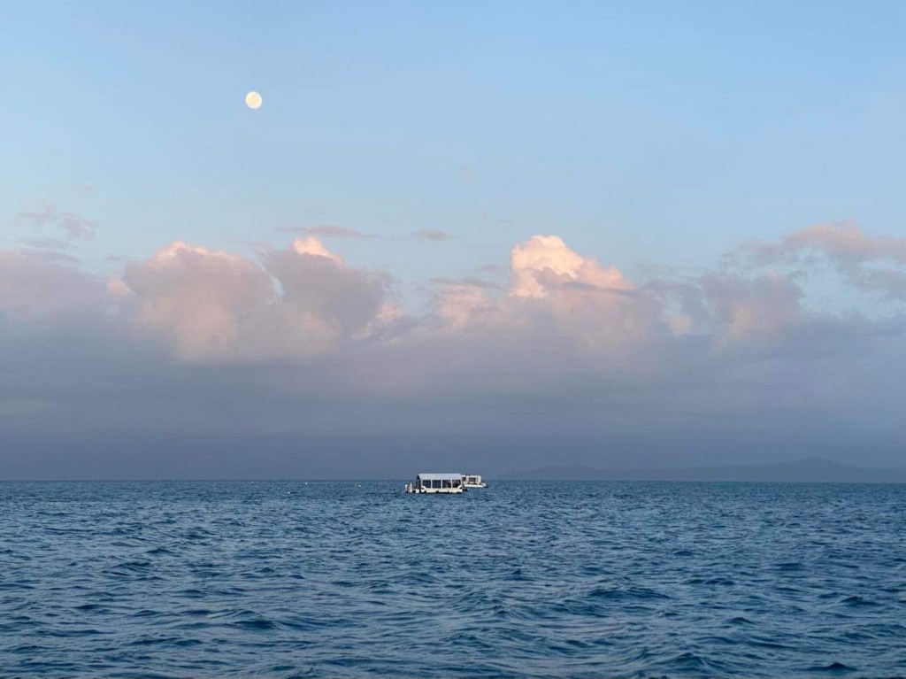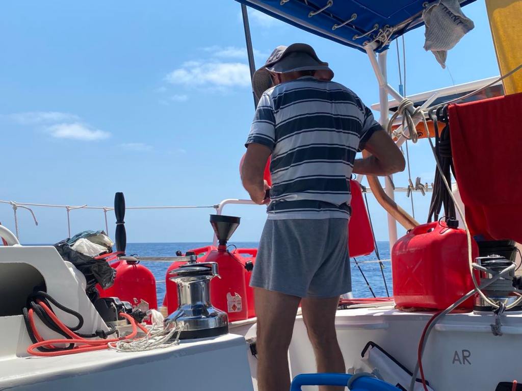 Mardi 26, moteur, moteur, moteur, on décide de s’arrêter à Ashmore Reef pour attendre du vent, le capitaine prévoit de caréner mais il se remet à peine de sa crève et je ne trouve pas que ça soit le moment, il pense au bateau, je pense à lui, en attendant il remet du gasoil dans le réservoir, faire ça en pleine nav ça montre à quel point il n’y a pas de mer et pas de vent :