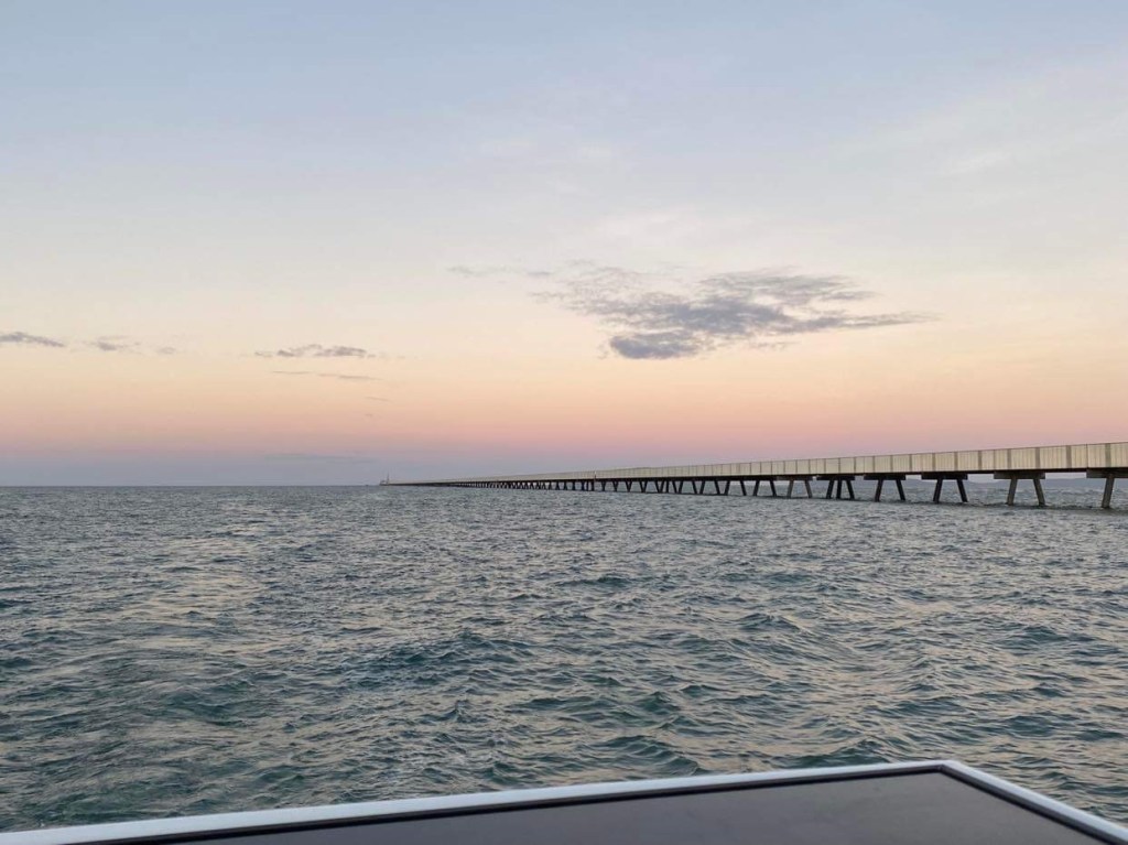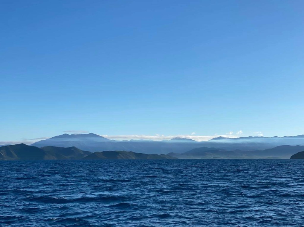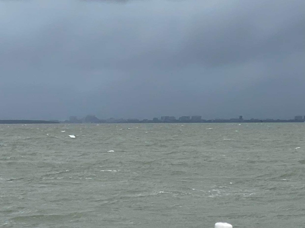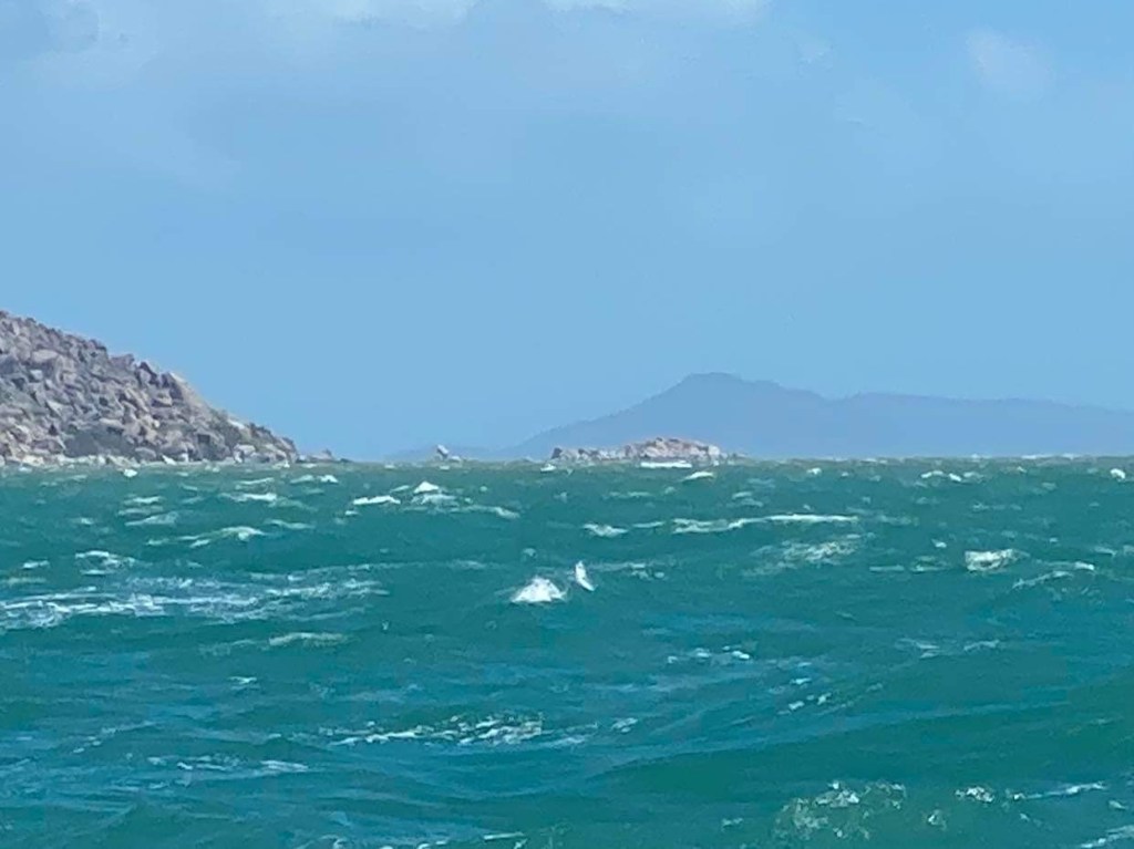 Le vent remonte à 6/8 nœuds, toujours au près, on éteint le moteur et on met le pilote en mode vent, vent qui adonne et refuse à son gré, le bateau zigzague, et en plus on avance à moins de 5 nœuds, on n’est pas rendus … on voit des bancs de poissons qui s’ébattent, je pense qu’ils s’amusent et mangent de la friture qui nage en surface, le capitaine pense qu’ils essaient d’échapper à un gros poisson qui les chasse, j’aime cette diversité d’imagination selon sa façon d’être, c’est tellement parlant, qui vit sa vie comme un jeu et qui comme un combat …