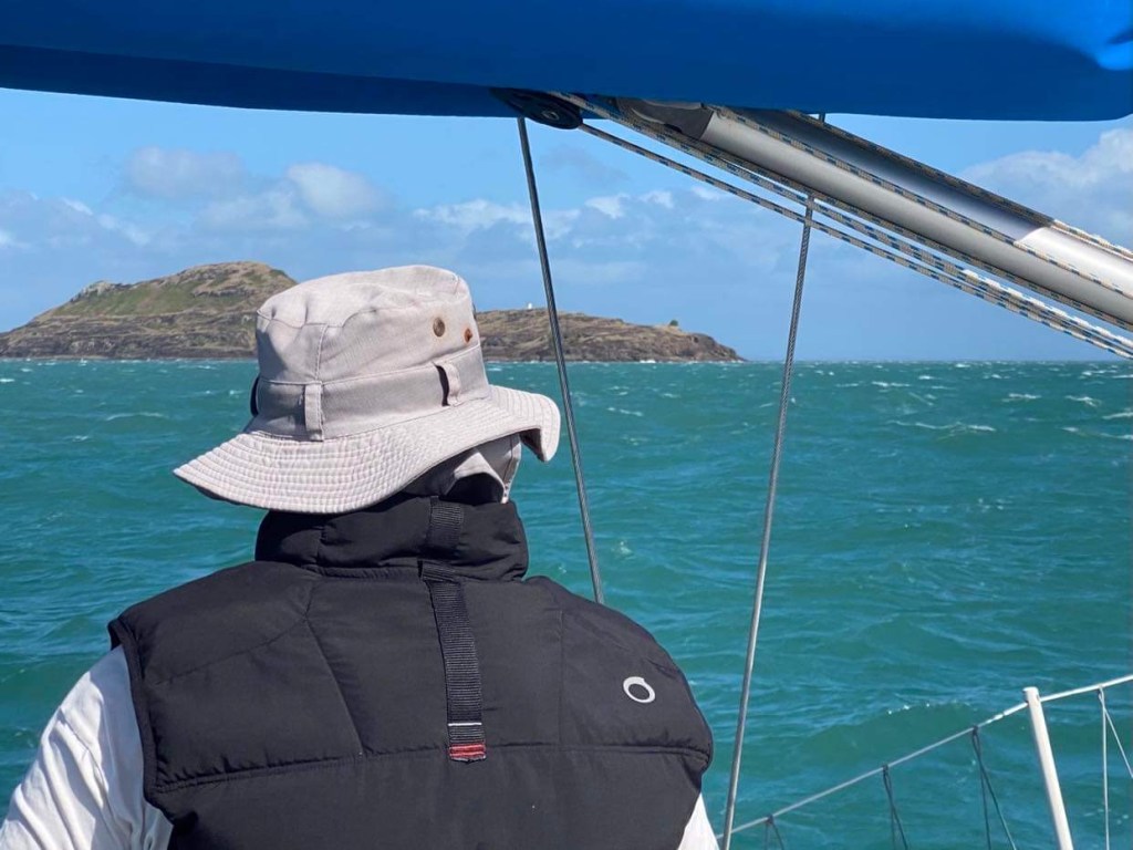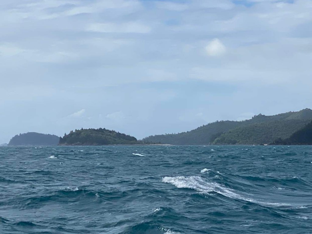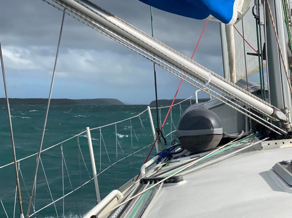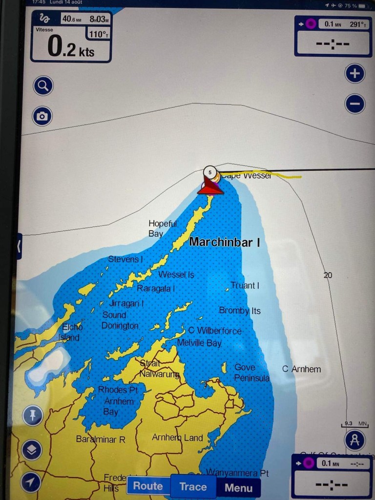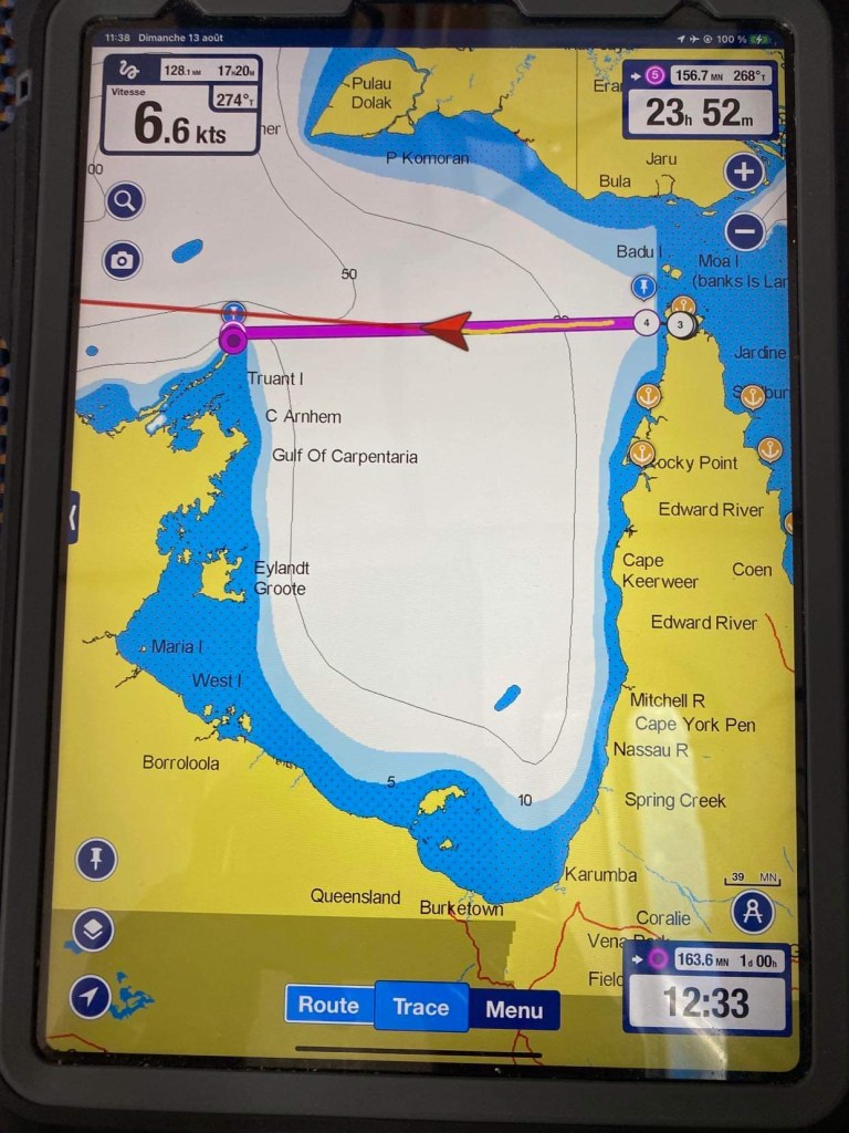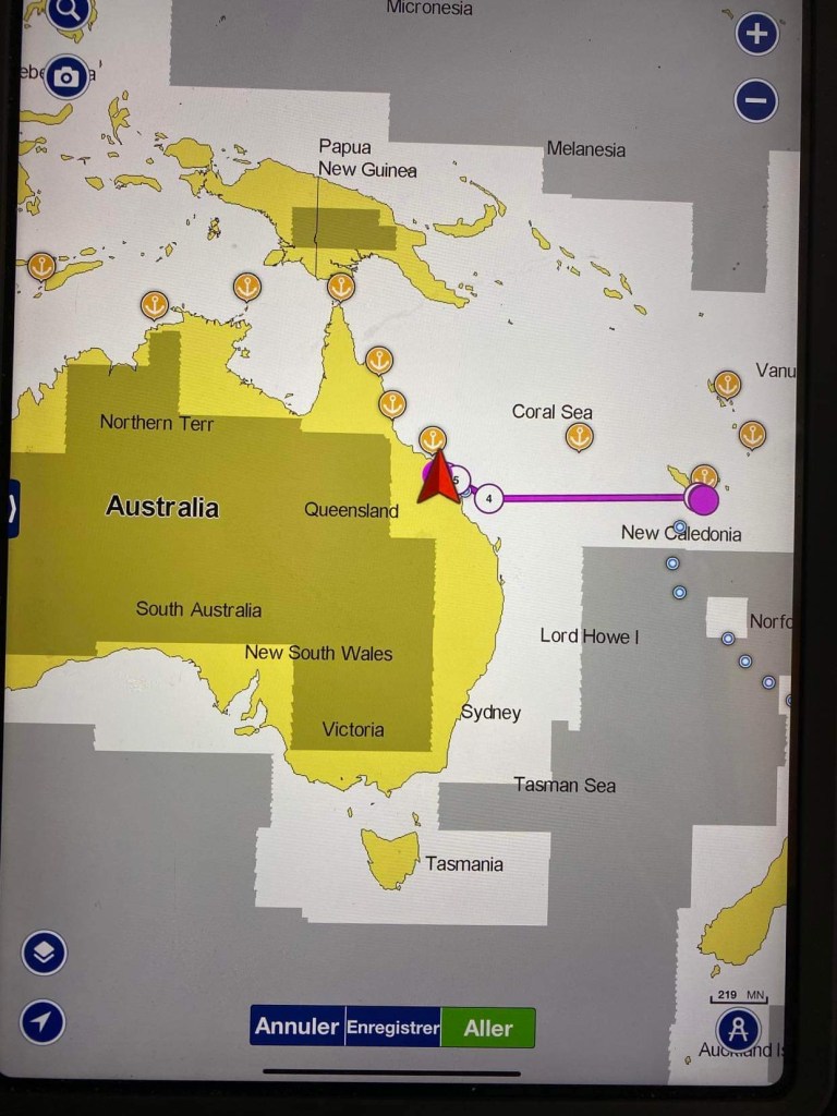 Dimanche 24, enfin le vent tourne sud-ouest après 8h, le capitaine, encore fiévreux mais qui va tout de même un peu mieux, hisse la GV qu’il avait affalée en pleine nuit puisqu’alors on avait si peu de vent, et de face pour faire bonne mesure, un pile petit vent d’Ouest, on a encore passé la nuit au moteur, là on a entre 7 et 10 nœuds, on avance entre 4,5 et 6 mais on avance à la voile, gloria, à part nous, il ne se passe rien … mais si, un avion de la border force australienne passe à ras du mas et nous appelle à la VHF pour des vérifications, c’était l’animation du jour.