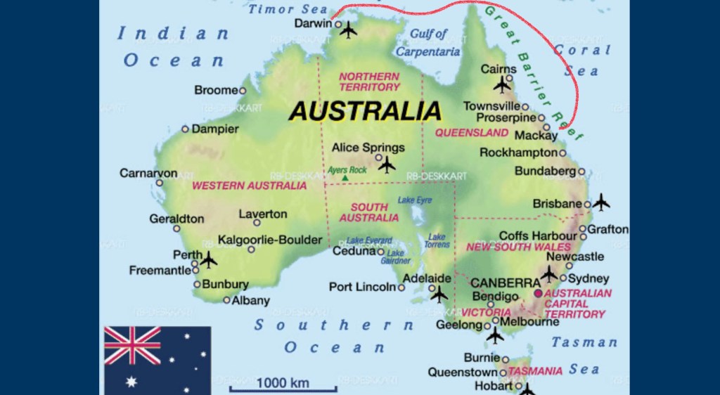 Cette fois on revient d’avoir passé 2 semaines au pays, c’était bien de voir les vignes en septembre et la cueillette du raisin, j’en ai goûté un grain au bord d’un chemin, d’une délicioseté surlecultante, d’un goût ! d’un sucré ! je ne sais pas ce qu’en disent les œnologues mais je crois que 2023 sera une super bonne année si je me fie à ce seul grain, bref, nous revoilà à Darwin, Cap de Miol n’a pas coulé dans la marina (on nous avait demandé de laisser un jeu de clés à la capitainerie au cas où un incendie à bord se déclencherait ou en cas de coulage, les Australiens ont vraiment l’air de craindre ce genre de trucs, à croire que leurs marinas ne sont pas fiables), le bateau est prêt, on fait des courses et on quitte Darwin le 22 septembre, on a 4500 NM à faire jusqu’aux Seychelles mais il est prévu quelques arrêts, Asmore Reef au besoin, Christmas Island et les Cocos Keeling Islands ça c’est certain, à débattre pour les Chagos, on part au près avec 12 nœuds de vent, on avance à 6,5 grâce à un petit courant dans le cul bienvenu, on gîte un peu, c’est fou comme on perd vite l’habitude d’être sur un truc qui bouge mais au moins ça ne bouge pas bézef, les douaniers ont fouillé le bateau de fond en comble avant de nous laisser partir, ils cherchaient des armes ou de la drogue, 2 douaniers nous ont demandé d’un air sévère de rester dans le cockpit pendant que les 2 autres soulevaient les matelas et les planchers avec des lampes torches pour y voir, mais ils ont beau fouiller partout il y a des endroits qu’ils ne connaissent pas et où on aurait pu planquer tout ce qu’on veut, mais bon, on aurait bien trop peur pour jouer à ça, on est tellement plus serein quand on n’a rien à se reprocher, quand on est partis le capitaine se demandait s’il valait mieux avoir une arme à feu à bord pour dissuader d’éventuels pirates ou aucune arme pour ne pas se faire gauler par une douane, on a opté pour la seconde solution parce qu’il y a plus de douaniers que de pirates sur terre, et vraiment pas grand monde sur mer.