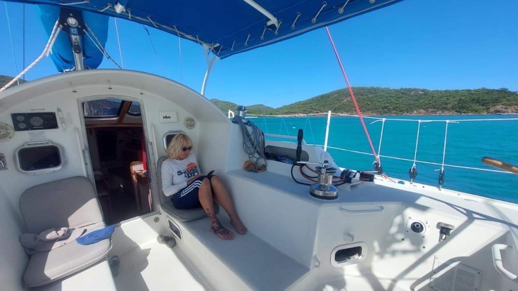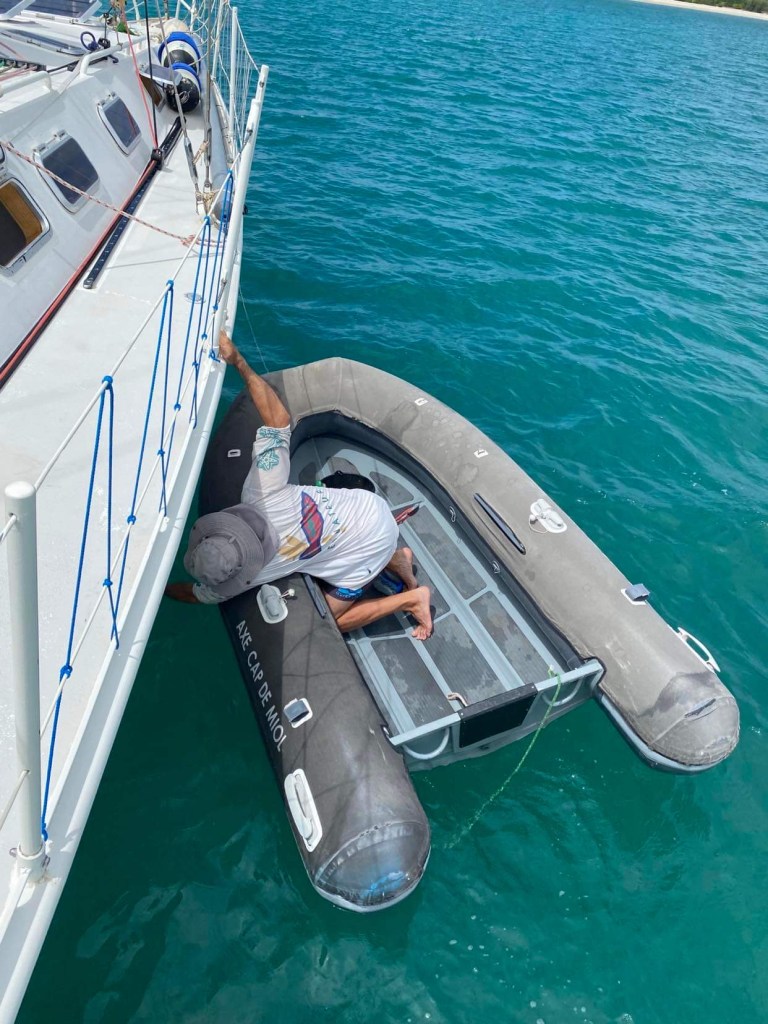 Il a souri en regardant par terre, de ce sourire qui lui plisse le coin des yeux et qui me fait fondre pour tout dire et je crois qu’il a marmonné que lui non plus ne veut pas devenir un boudin avant de faire quelques séries, il faut dire qu’on n’a pas souvent l’occasion de faire des séances : soit le bateau bouge trop en nav, soit on est au mouillage et le cockpit est rempli de ce que bricole le capitaine, soit il pleut à verse et le cockpit est trempé, soit je bosse et le capitaine bricole, il va falloir tout recommencer quand on rentrera de notre périple.