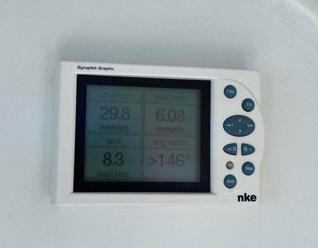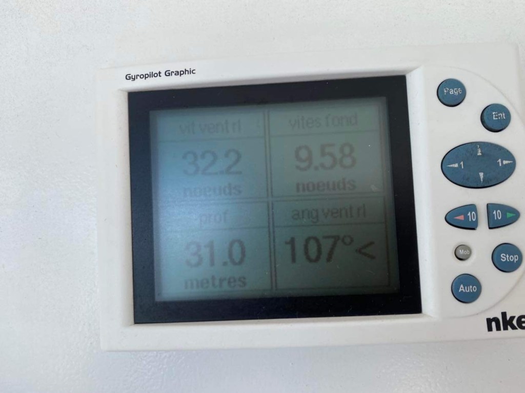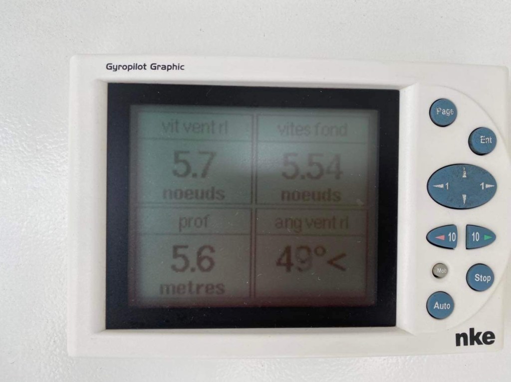 Pourvu que ça dure, mon souhait est exaucé puisque ça monte même à 14/15 avec des pointes à 17/18, on avance à plus de 7, pointes à plus de 8, sur une mer à peine houleuse, parfait, si seulement c’était tout le temps pareil.
