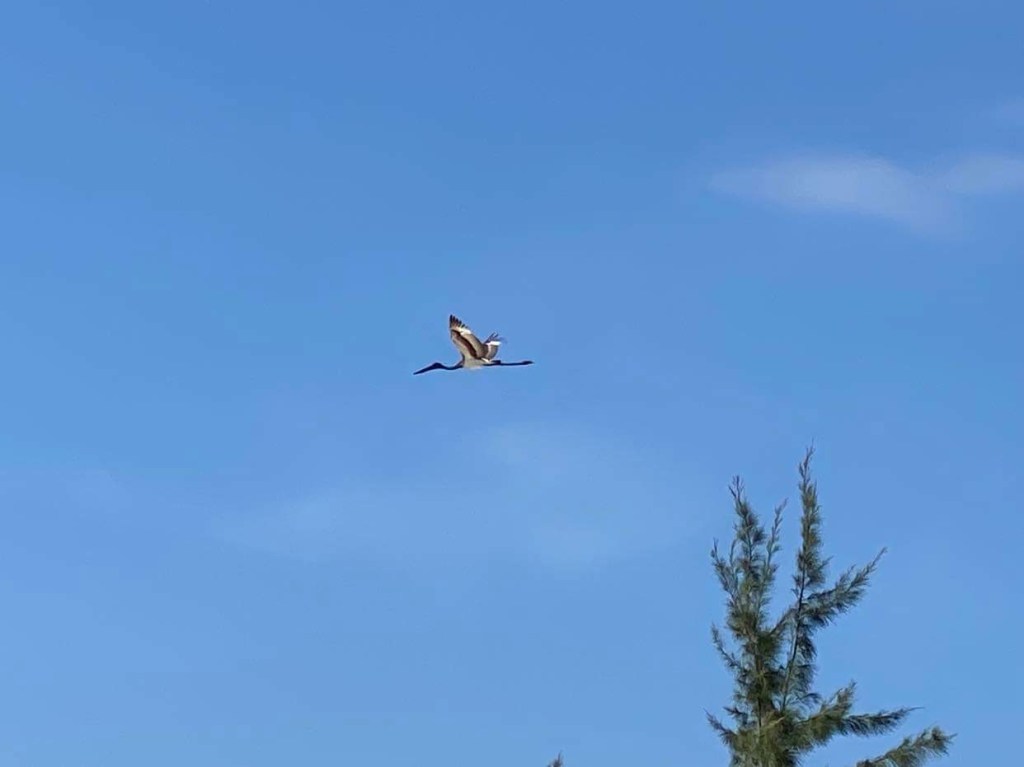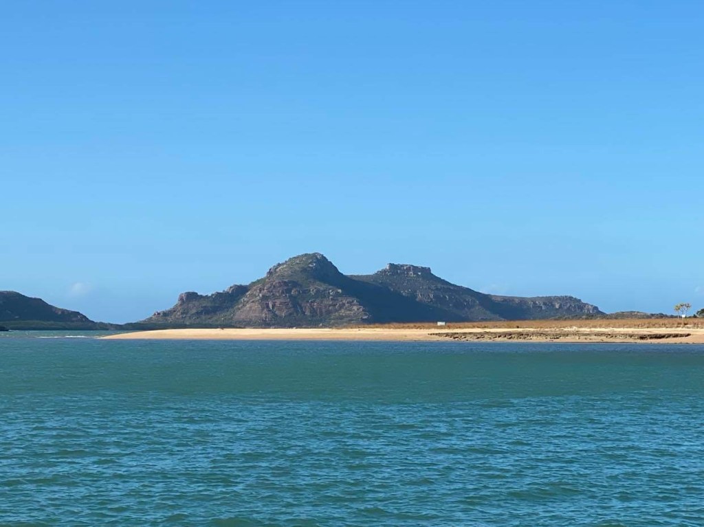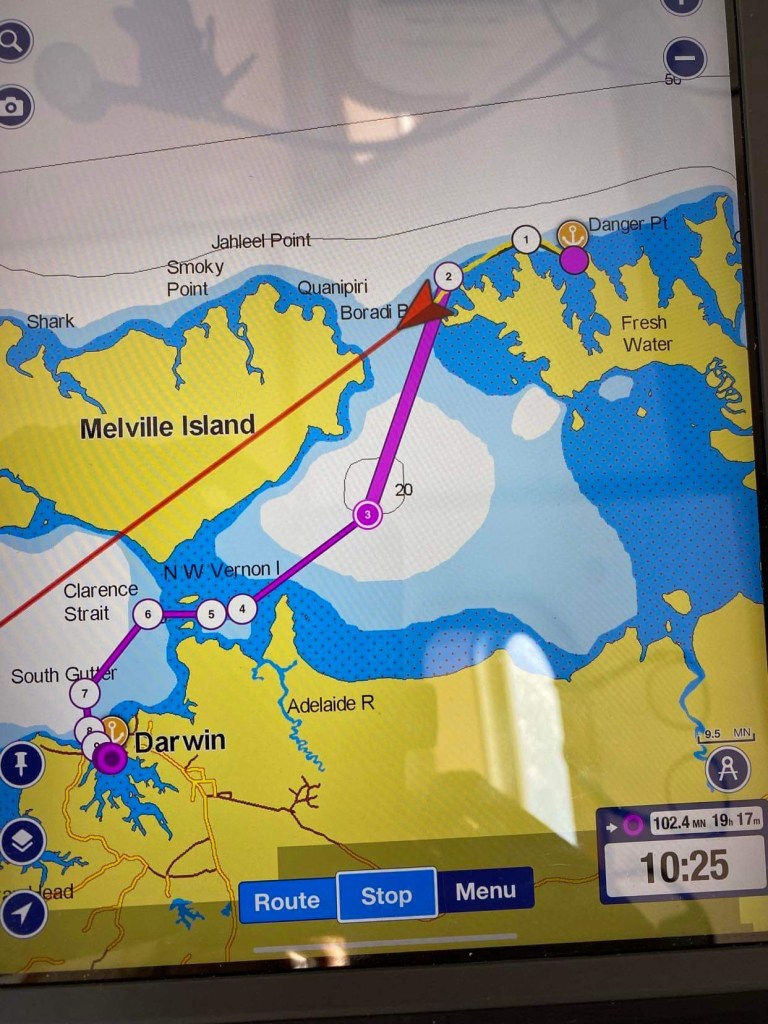 Mon téléphone est passé à l’heure locale, 2h1/2 de moins qu’à Darwin, comme on suit à peu près le soleil on se décalait au fur et à mesure à la louche, par exemple ce matin on a pris le petit déjeuner à 10h de l’heure qui s’affichait sur nos montres, mais en fait il était 7h30, c’est un peu plus marin comme horaire. Ce ne sont pas des poissons qui nous accueillent ici mais des oiseaux, plein d’oiseaux !