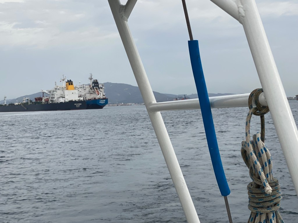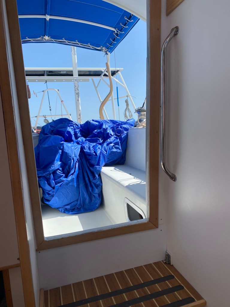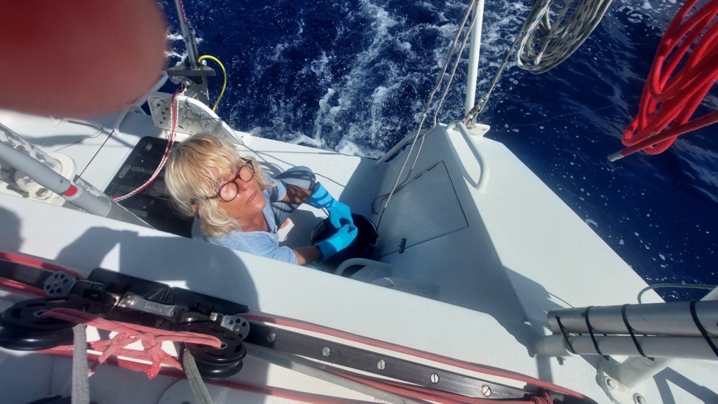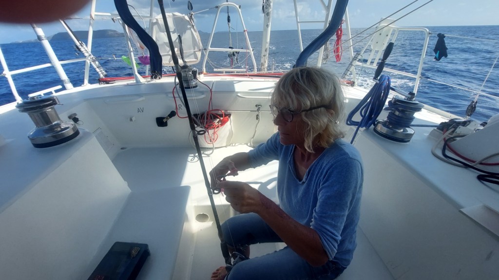 quand j’ai terminé, il arrive tout ébouriffé et me dit qu’on va mettre une seconde ancre derrière le bateau pour le stabiliser, tout un programme alors hop on s’y met, entendez bien : il faut mettre à l’eau l’annexe qui est posée dégonflée sur la jupe arrière, une fois qu’elle est posée sur l’eau il faut la regonfler pendant qu’elle saute et tressaute sur les vagues, un vrai plaisir, en évitant de balancer le gonfleur à l’eau, puis chercher à 4 pattes fesses en l’air la seconde ancre bien rangée dans un coffre de la jupe et un long cordage pour l’y attacher, bazarder le tout dare-dare au fond de l’annexe parce que l’heure tourne et enfin sauter dedans … c’est moi qui dois conduire l’annexe sous les ordres du capitaine, pendant qu’il tient fermement l’ancre pour la jeter à l’endroit élu à force de réflexion derrière un front plissé par l’intensité du processus, et dévider le long cordage jusqu’au bateau pour l’y fixer, parce que balancer une ancre à la flotte sans l’accrocher au bateau serait d’une crétinerie sans nom, donc c’est le plan …