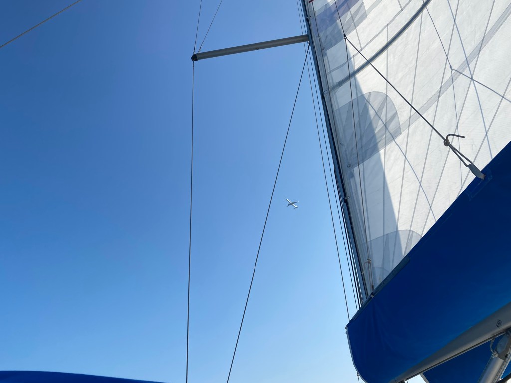 - et voilà une barre de flèche (le bitonio horizontal)(notez l’avion qui passe dans le ciel) – les barres de flèche sont des petits espars (vous chercherez la définition sinon j’en finis pas), perpendiculaires au mât des voiliers, permettant une meilleure tenue des mâts en écartant les haubans afin d’avoir un meilleur angle de maintien et diminuer la compression sur le mât :