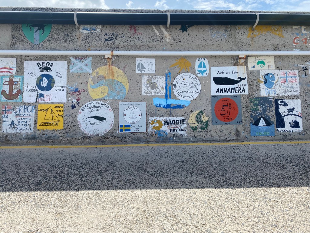 Il s’y colle et après ça, dégoûté, décide qu’ouste on remonte l’annexe pour filer vers un autre mouillage, finalement on arrive à la marina de Calheta plus au sud, autant y aller plutôt que de tenter un autre mouillage car ça roule de mal en pis, arrivés au ponton d’accueil un gars nous saute dessus pour nous expliquer que la marina est blindée, pas de place pour nous, il va falloir qu’on se coltine la houle en allant mouiller plus loin … je ne sais pas pourquoi, parce qu’on a l’air malheureux ? parce que c’est son anniversaire ? parce que Dieu existe et se soucie de deux pauvres hères tandis qu’il délaisse quelques milliards d’autres êtres humains en état de guerre ou de famine ? ce point restera assurément obscur à jamais, quoi qu’il en soit le gars en question nous explique moitié en portugais moitié en anglais qu’il appelle sa chef, et j’ai beau ne rien piper à son jargon, j’entends qu’il répond à sa chef qu’on aborde les pavillons portugais et madérien (37 € d’investissement bien placés on dirait, dire que j’avais trouvé ça prohibitif), visiblement c’est bien perçu et le gars nous dit en raccrochant qu’on peut rester là, qu’il faut juste qu’on recule pour laisser la place aux bateaux qui viennent prendre de la gazoline, on ne se fait pas prier pour s’exécuter, et une fois amarré comme des chefs, assis dans le bateau à plat, on se dit qu’il n’y a vraiment rien de meilleur au monde que d’être à plat !