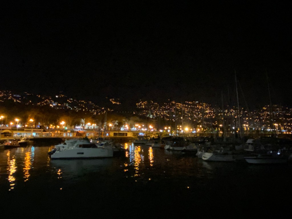 Marcher sur un sol stable et dîner à table refait de nous des êtres à peu près civilisés, je me demande quand-même quelle tête j’ai (j’avais, pour voir ma tête justement, acheté un petit miroir rond que le capitaine a collé sur une cloison de la salle de bains, qui n’est en fait qu’un cabinet de toilette d’un mètre carré, à y bien réfléchir 80 centimètres carré à tout casser, mais que j’appelle salle de bains, on ne se refait pas, et justement le capitaine avait évoqué le fait que ça ne soit pas forcément très judicieux de vouloir voir nos têtes, un matin il s’est plaint de la sienne et j’ai eu toutes les peines du monde à tempérer son avis, je crois même que je n’y suis pas arrivée, c’est difficile, voire impossible, malgré de louables efforts, de lui faire croire en un autre avis que le sien), rapide visite de Funchal by night et nous retournons dans notre petite maison qui flotte, le contraste est saisissant entre la terre ferme et le roulis du bateau, je me déplace comme Charlie Chaplin dans l’Emigrant, on se couche, le lendemain au réveil le capitaine me dit qu’il s’est levé la nuit dans l’idée de récupérer la seconde ancre qui apparemment ne servait à rien et peut-être même empirait les choses, mais las ! le cordage s’est entortillonné autour des rochers tellement le bateau a été secoué (ce qui l’empêchait de dormir) (moi j’ai rien vu ni entendu) et il doit plonger avec sa bouteille d’air comprimé pour récupérer et l’ancre et le cordage … de la dure vie de marin …